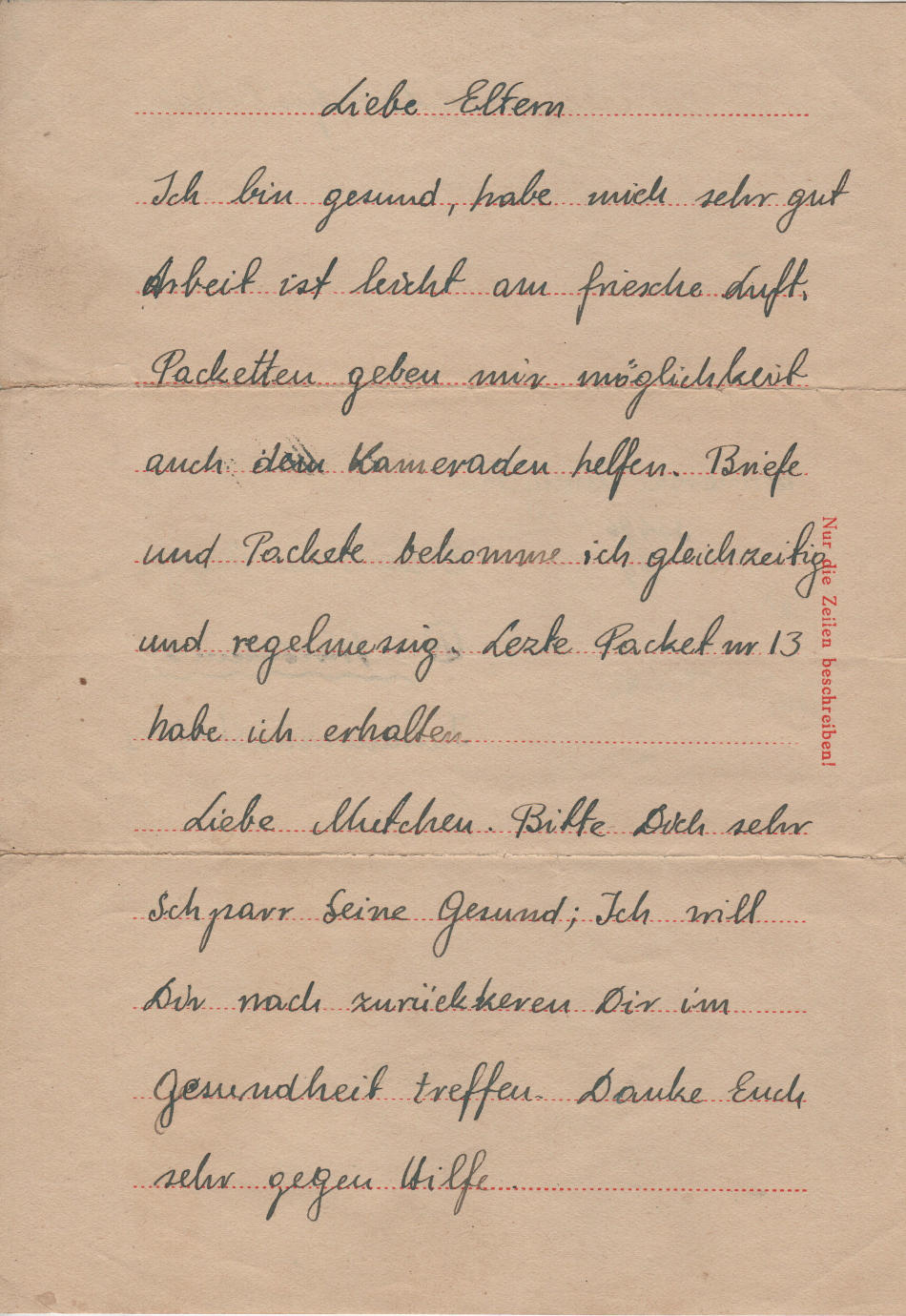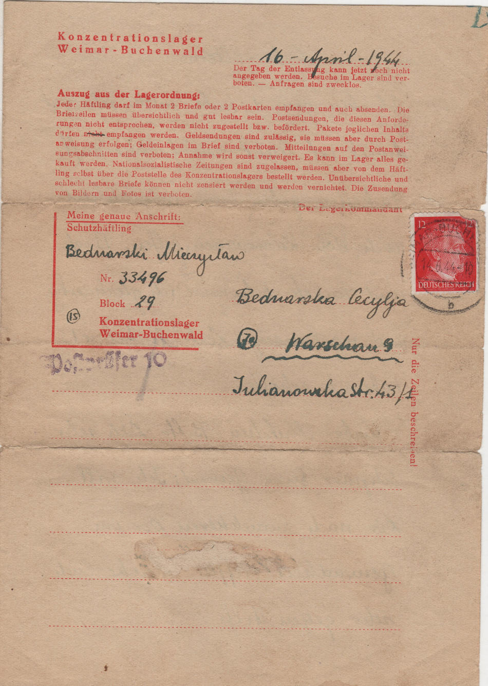 Lettera scritta il 16.4.1944 nel campo di concentramento a Warschau (Varsavia, Polonia)