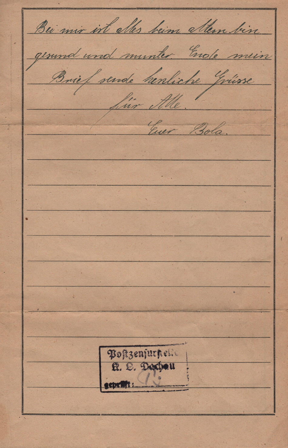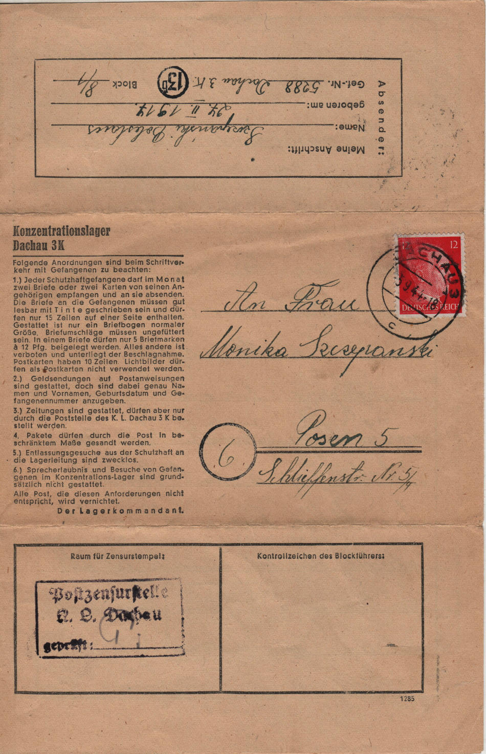 Lettera scritta il 3.9.1943 nel campo di concentramento e spedita a Posen (Poznan in Polonia)