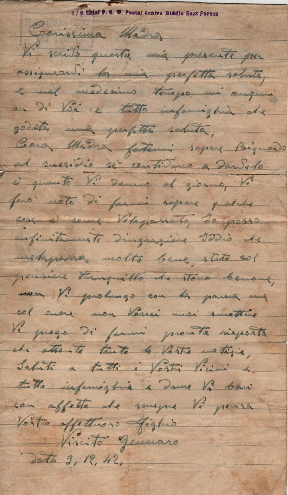 Lettera scritta il 9.12.1942 nel campo di prigionia e spedita in Italia a Cava de’ Tirreni, provincia di Salerno