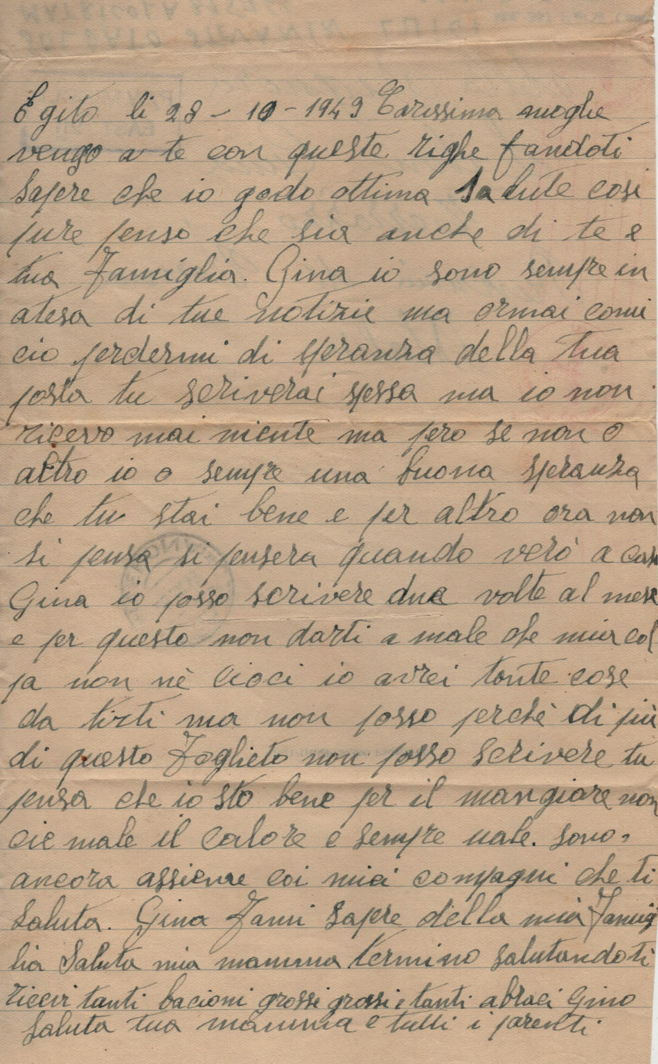 Lettera il 28.10.1943 nel campo di prigionia e spedita a Terrazzo, provincia di Verona, in Italia