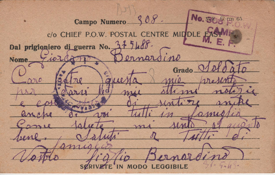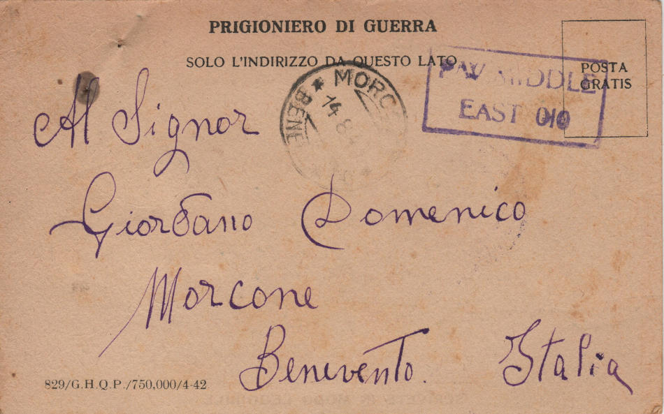 Cartolina scritta nel campo di prigionia e spedita a Marcone (provincia di Benevento) in Italia (timbro postale ricezione 14.8.1943)