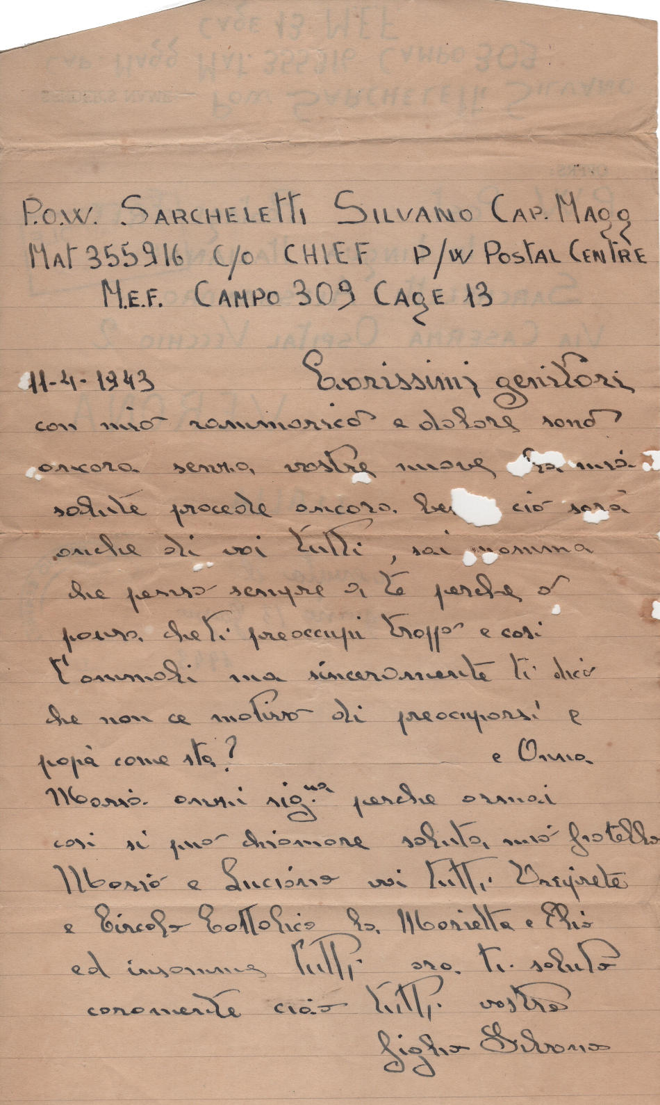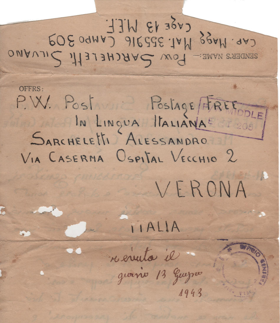 Cartolina scritta l’ 11.4.1943 al campo di prigionia e spedita in Italia a Verona