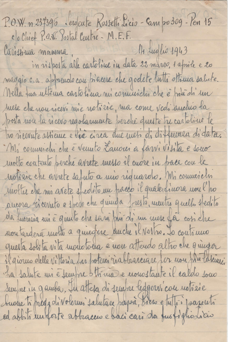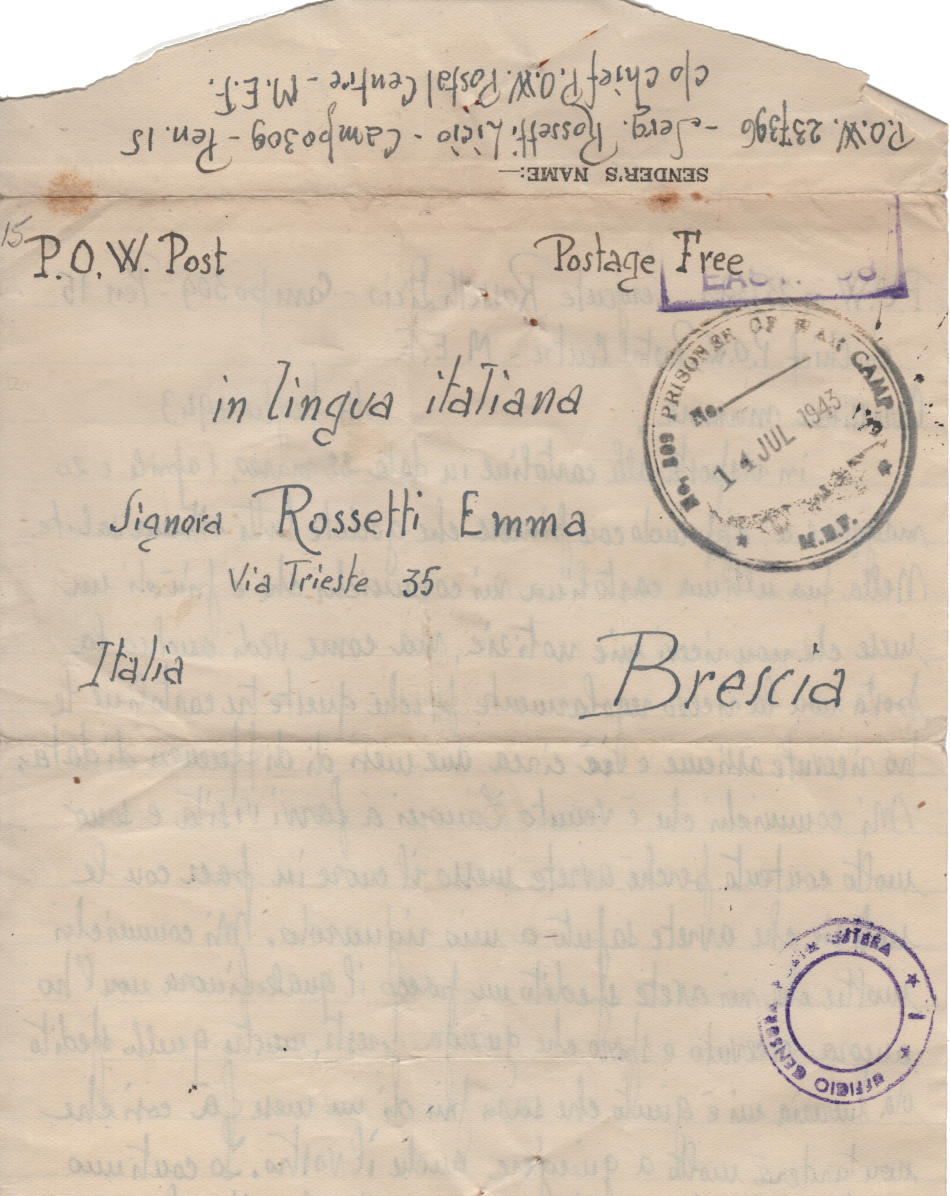 Lettera scritta il 14.7.1943 nel campo di prigionia e spedita in Italia a Brescia