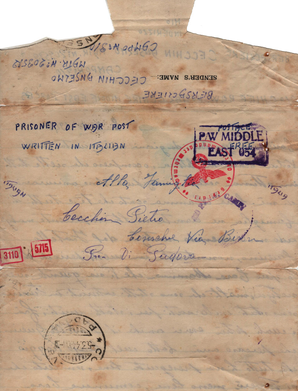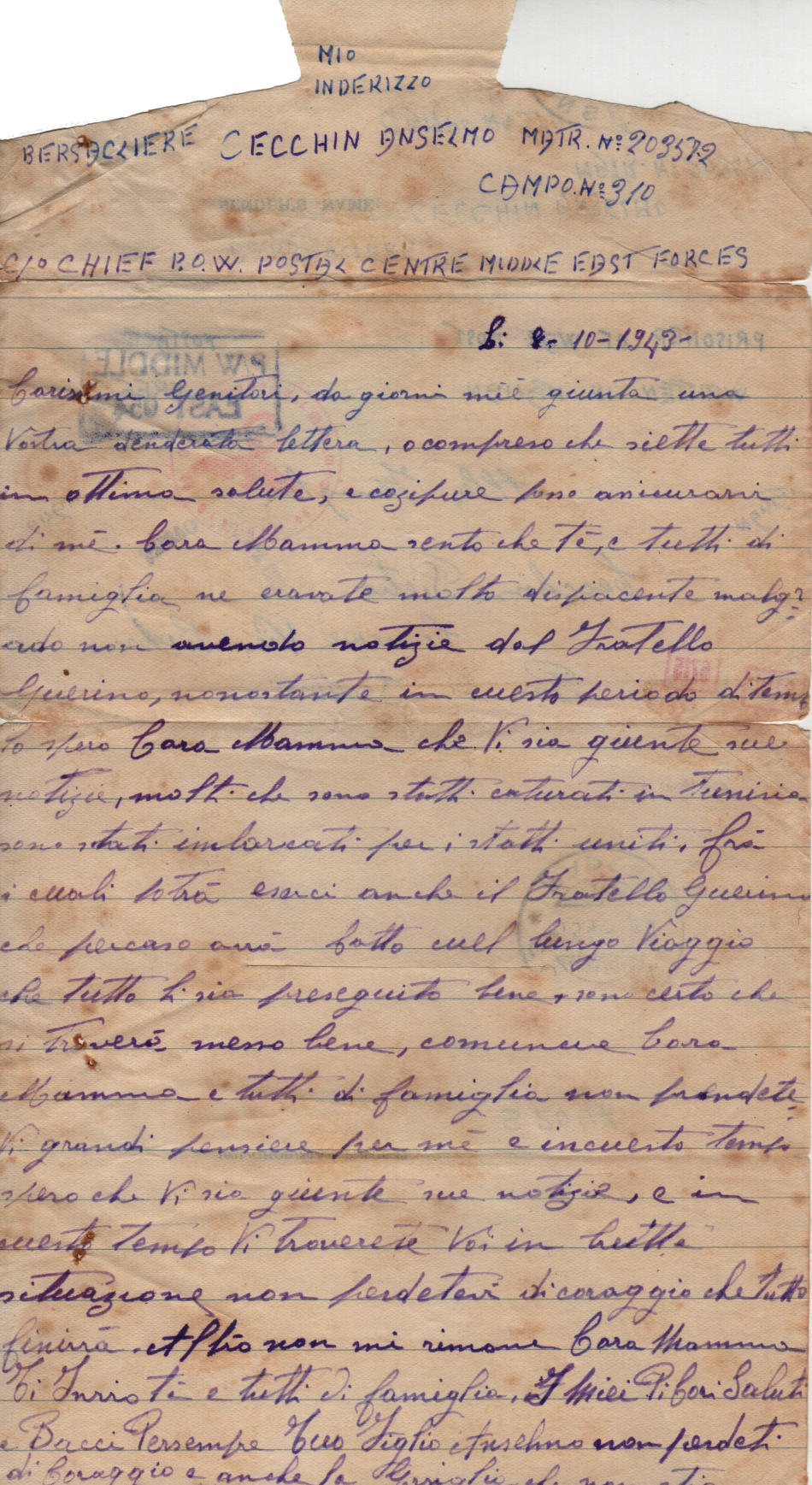 Lettera scritta l'8.10.1943 nel campo di prigionia e spedita in Italia a Conselve (provincia di Padova)