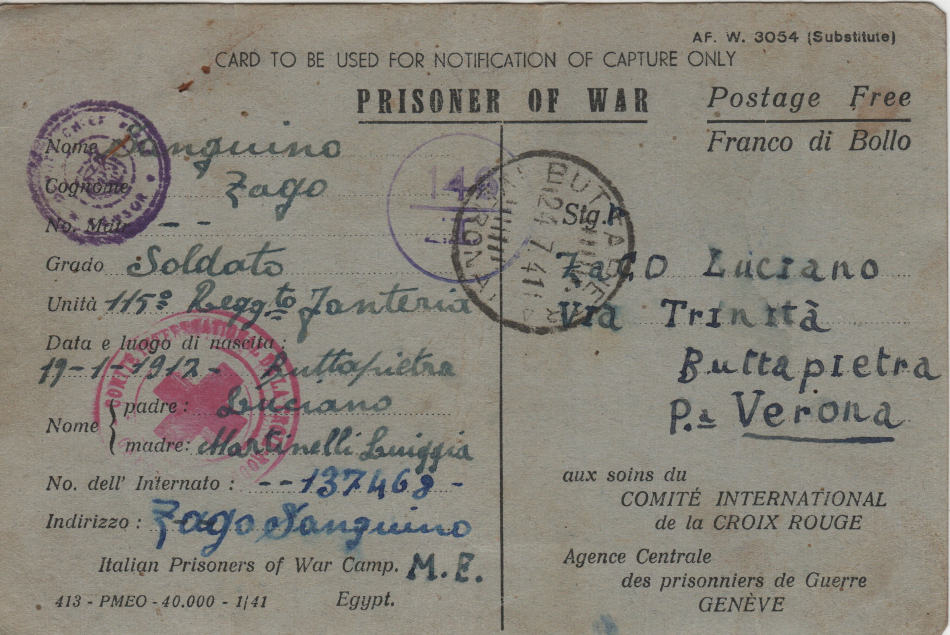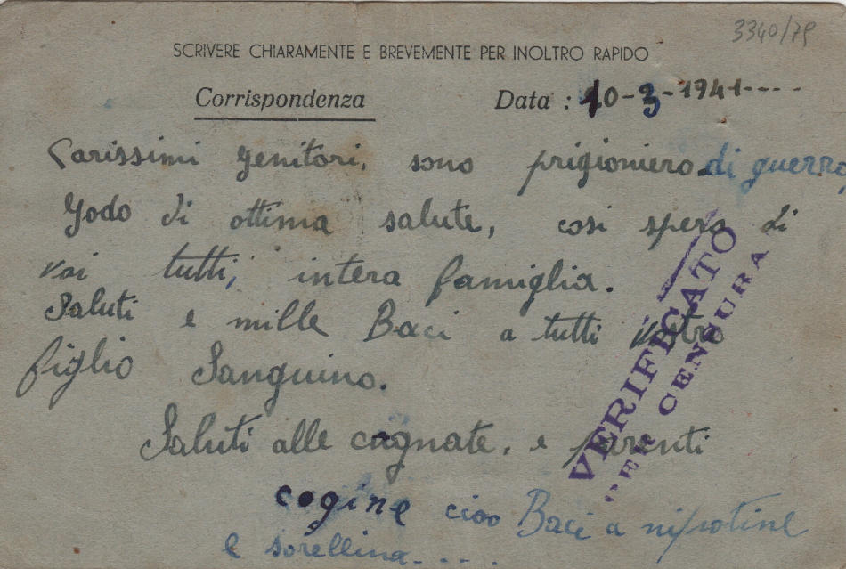 Cartolina scritta il 10.3.1941 nel campo di prigionia e spedita a Buttapietra (provincia di Verona) in Italia