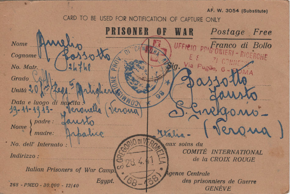 Cartolina scritta il 16.1.1941 nel campo di prigionia e spedita a S. Gregorio (comune di Veronella, provincia di Verona) in Italia