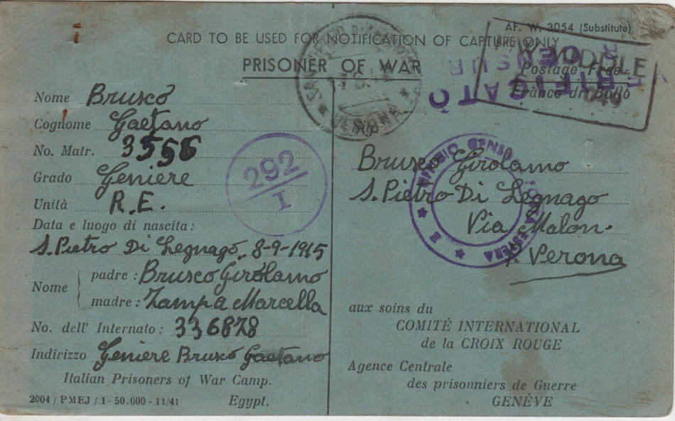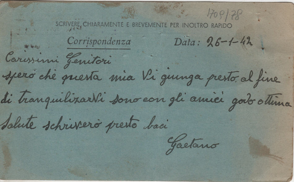 Cartolina scritta il 26.1.1942 nel campo di prigionia e spedita a S.Pietro di Legnago (provincia di Verona) in Italia