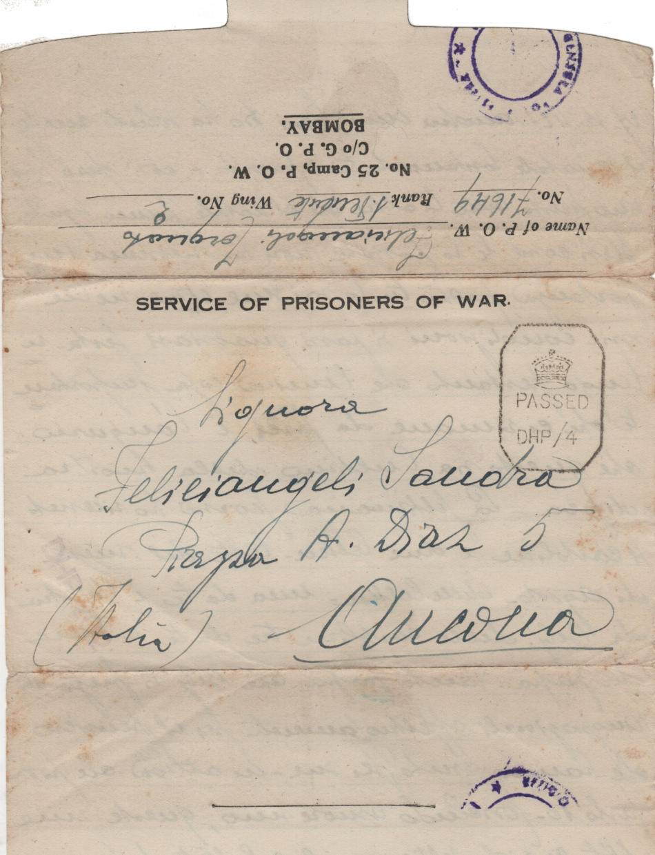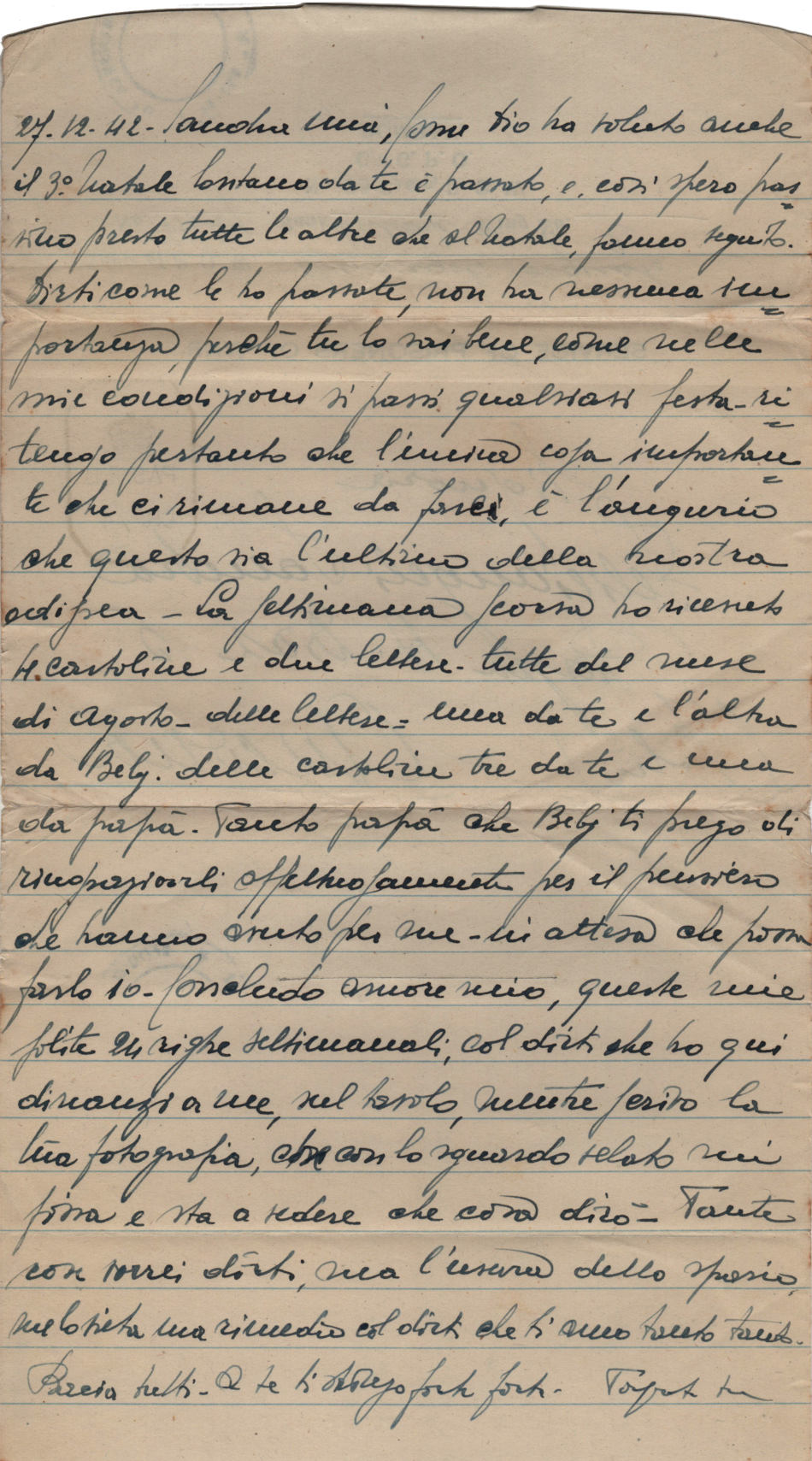 Lettera scritta il 27 Dicembre 1942 dal campo di prigionia e spedita ad Ancona in Italia