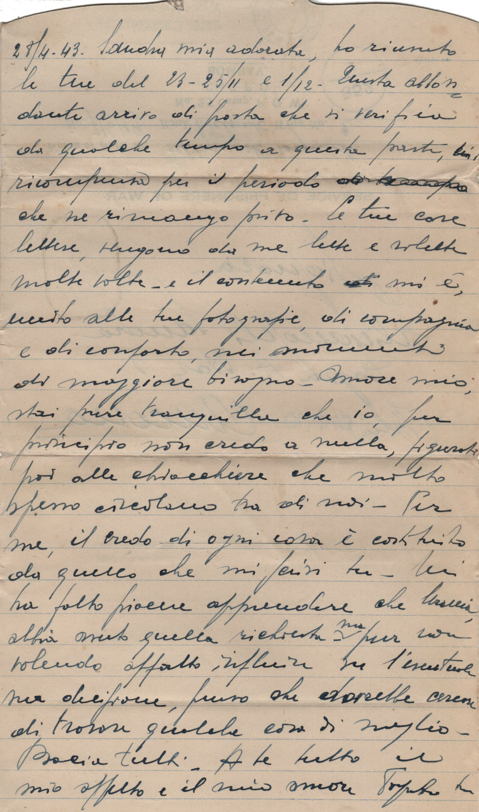 Lettera scritta 28 Aprile 1943 dal campo di prigionia e spedita ad Ancona in Italia