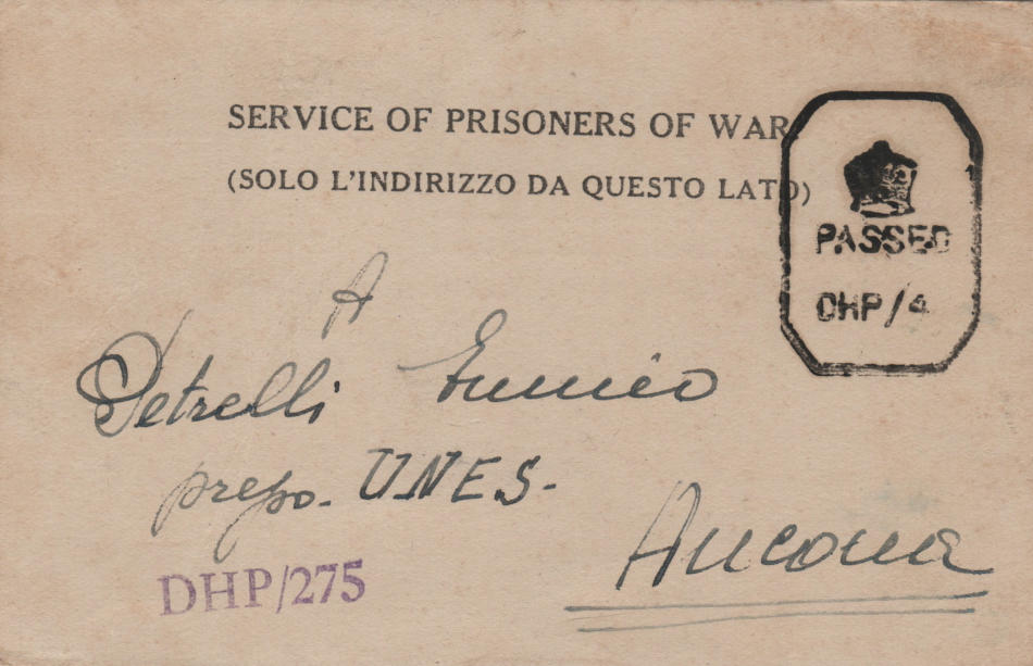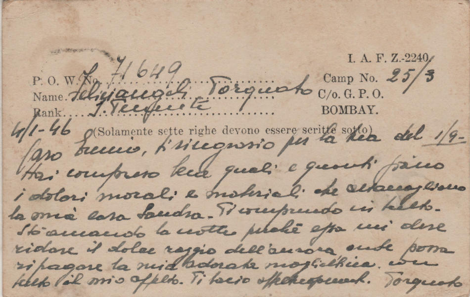Cartolina scritta il 4 Gennaio 1946 dal campo di prigionia e spedita ad Ancona in Italia