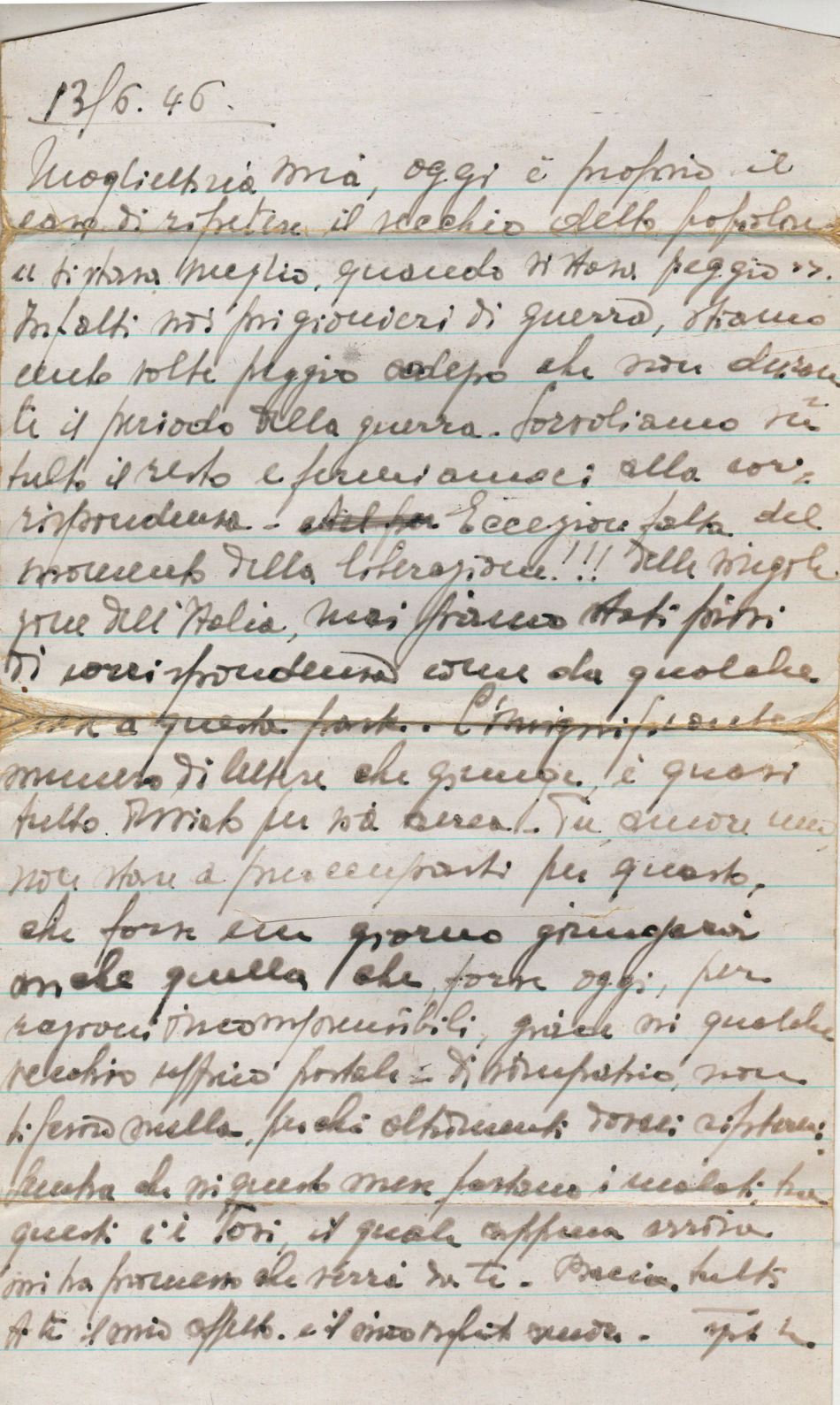 Lettera scritta il 13 Giugno 1946 dal campo di prigionia e spedita ad Ancona in Italia
