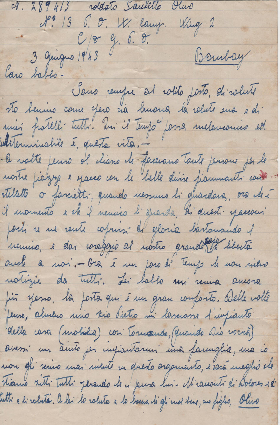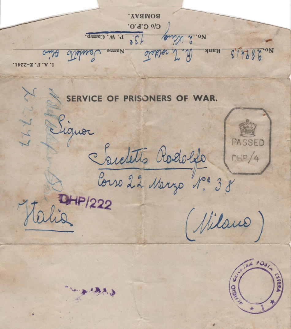 Lettera scritta il 3.6.1943 nel campo numero di prigionia e spedita a Milano in Italia