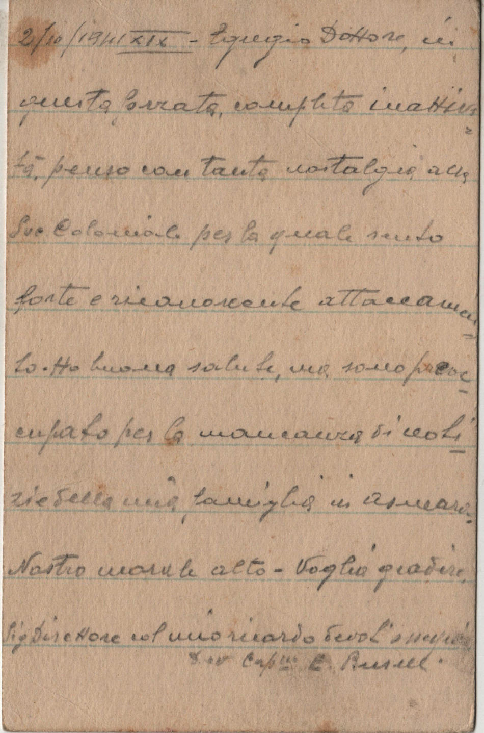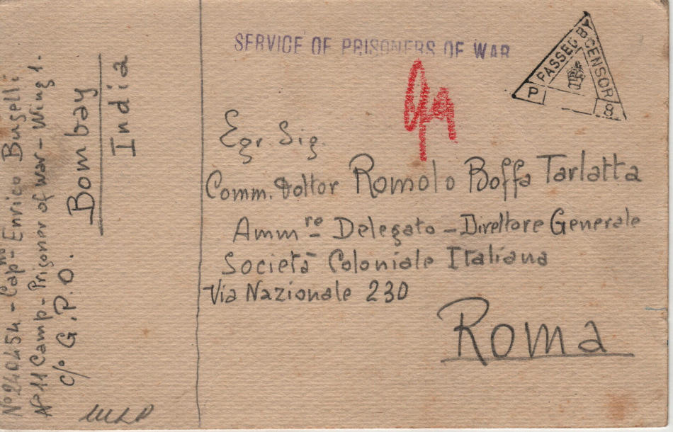 Cartolina scritta il 2.10.1941 nel campo di prigionia e spedita a Roma in italia