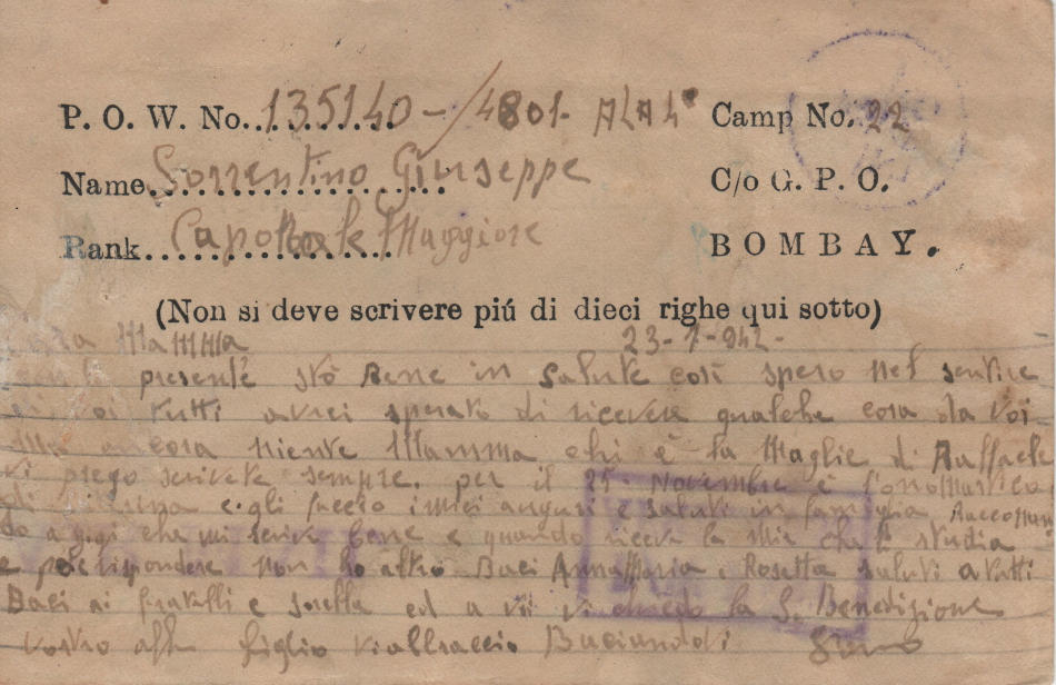Cartolina scritta il 23.7.1942 nel campo di prigionia e spedita a Catanzaro in Italia