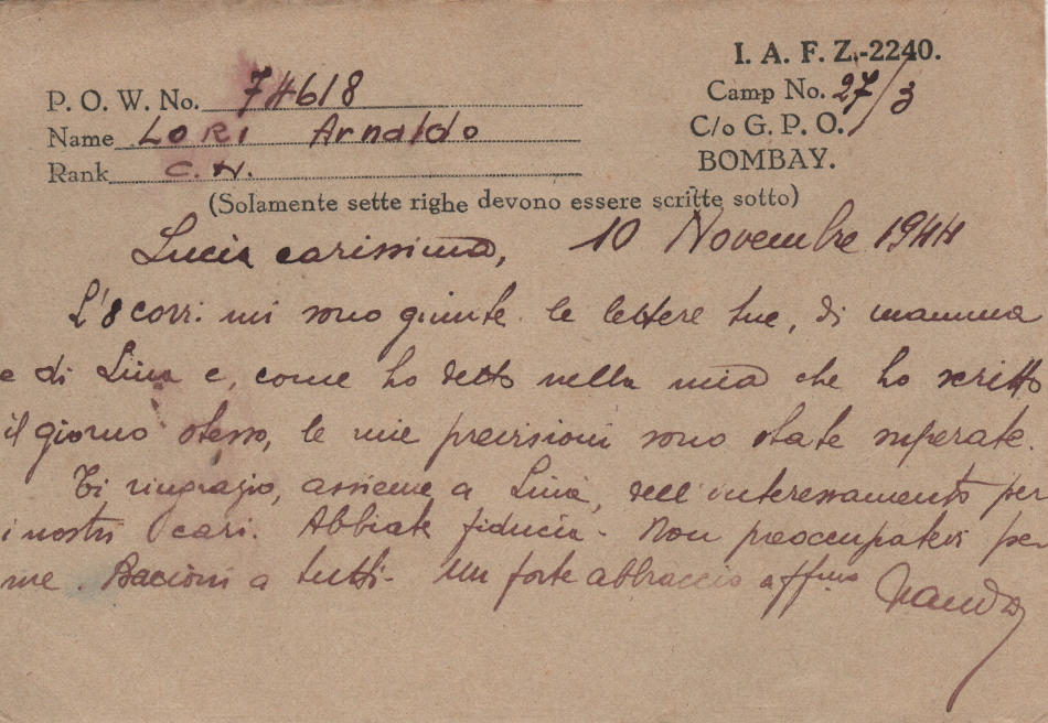 Cartolina scritta il 10.11.1944 nel campo di prigionia e spedita a Spello in provincia di Perugia (Italia)