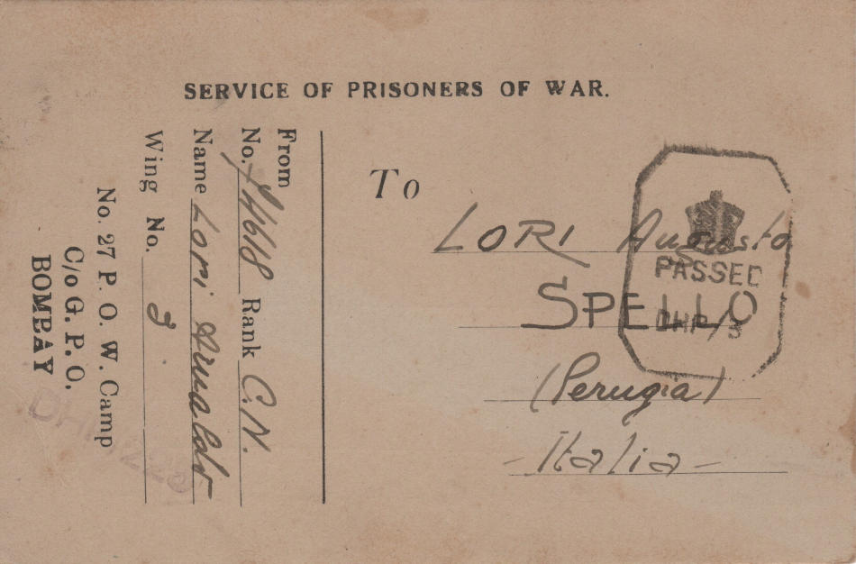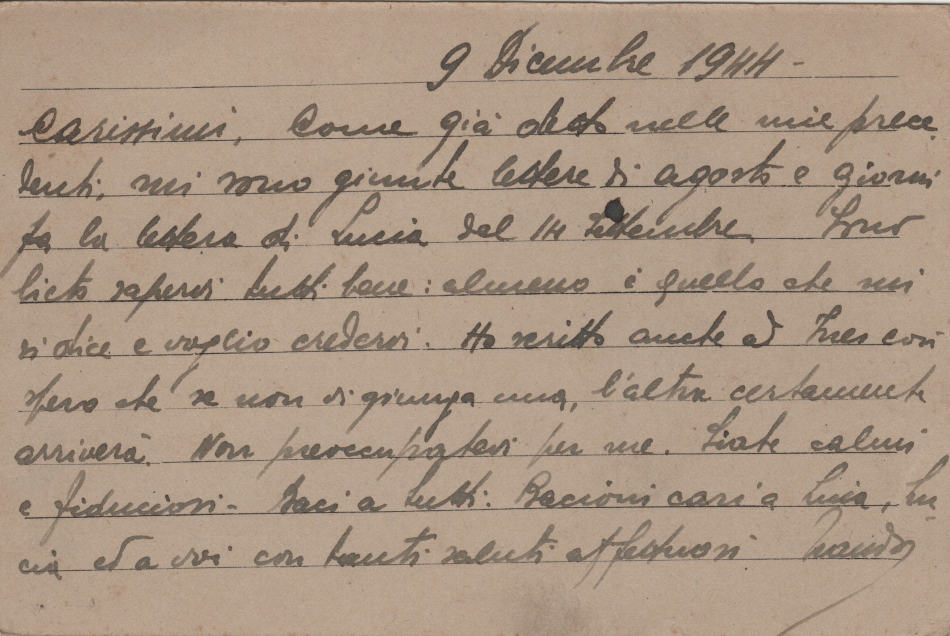 Cartolina scritta il 9.12.1944 dal campo di prigionia e spedita a Spello (Perugia) in Italia