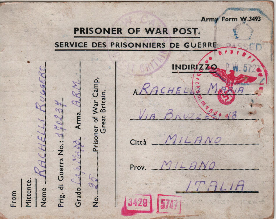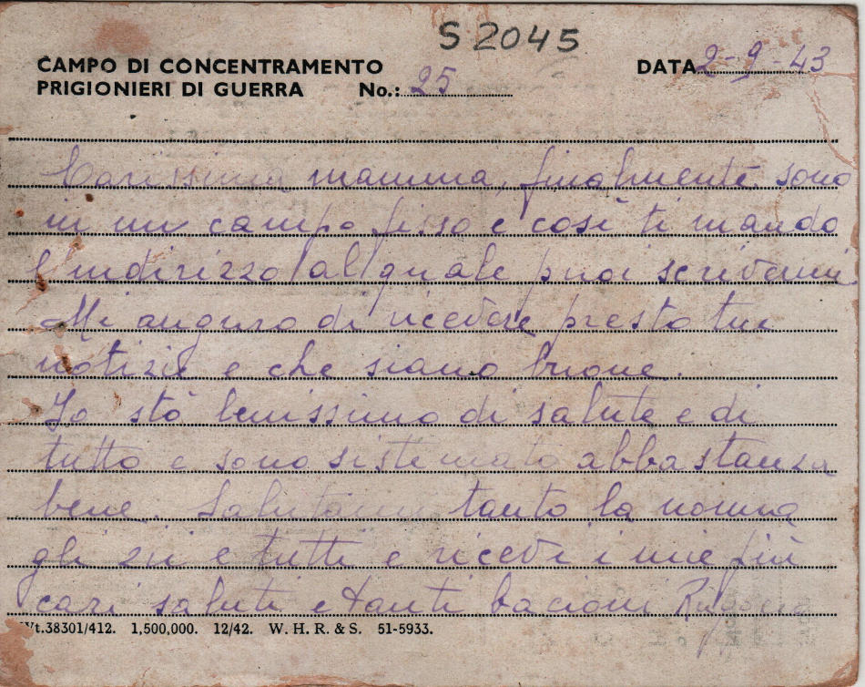 Cartolina scritta il 2.9.1943 nel campo di prigionia e indirizzata a Milano in Italia