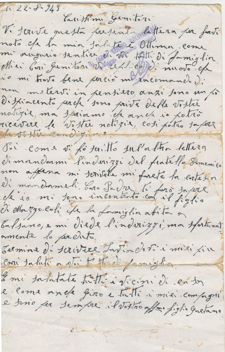 Lettera scritta il 22.8.1943 nel campo di prigionia e indirizzata a Taranto in Italia