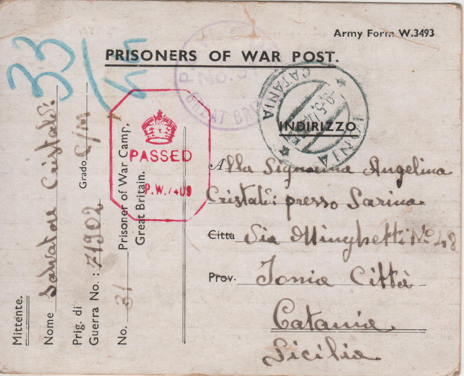 Cartolina scritta l’8.3.1944 nel campo di prigionia e spedita in Italia a Ionia (ora i comuni di Giarre e Riposto) in provincia di Catania (Italia)