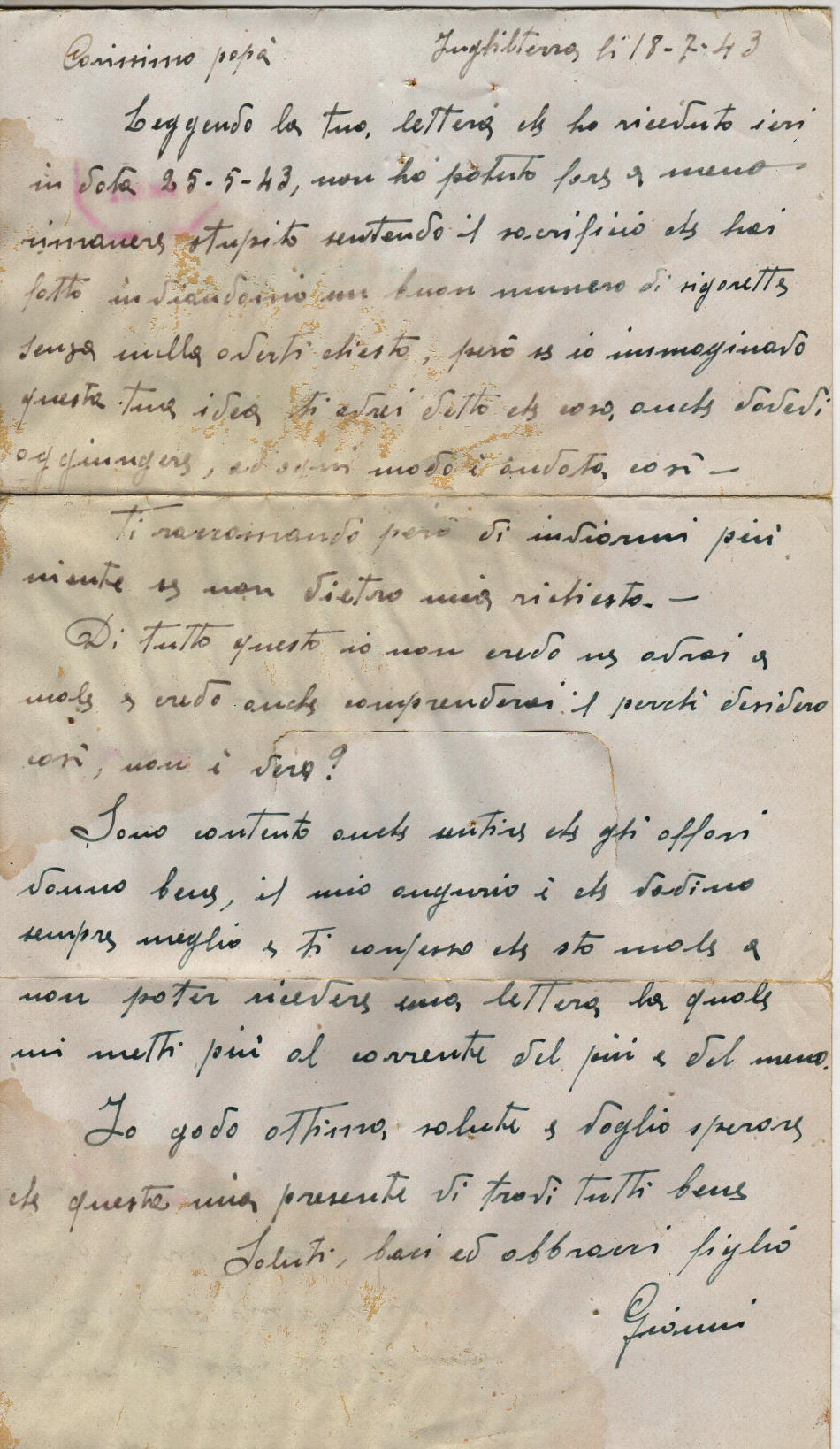 Lettera scritta il 18.7.1943 nel campo di prigionia e spedita a Brescia in Italia