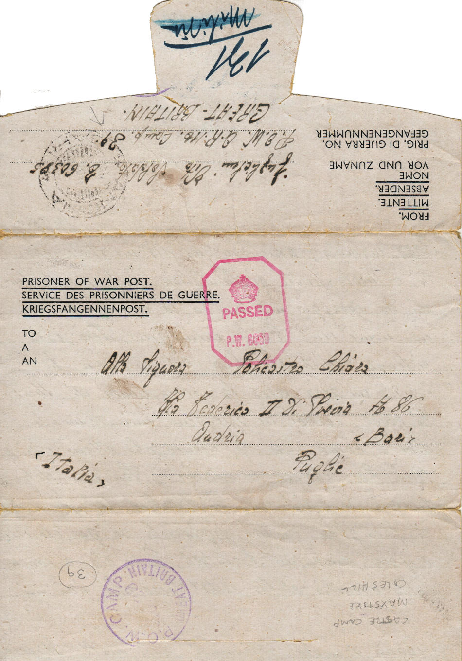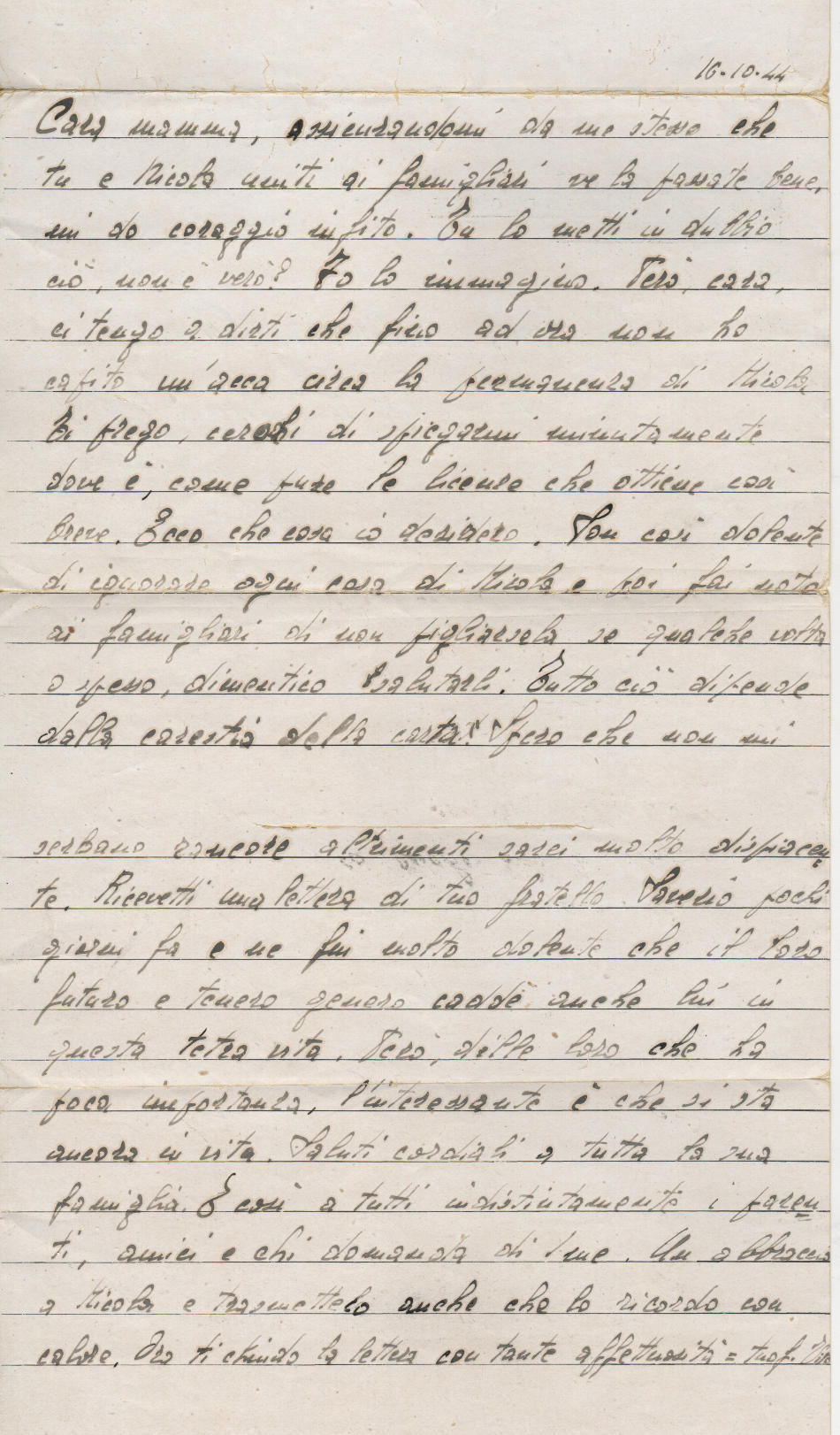 Lettera scritta il 16.10.1944 nel campo di prigionia e spedita a Andria (Bari) in Italia