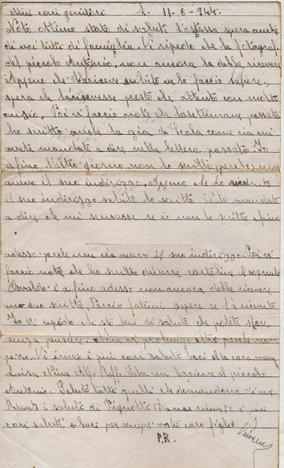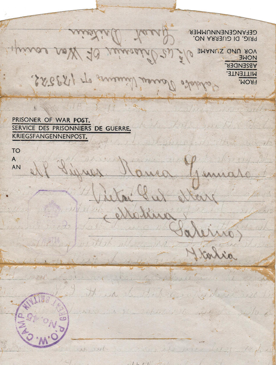 Lettera scritta l’11.6.1944 nel campo di prigionia e spedita a Vietri sul Mare (provincia di Salerno) in Italia