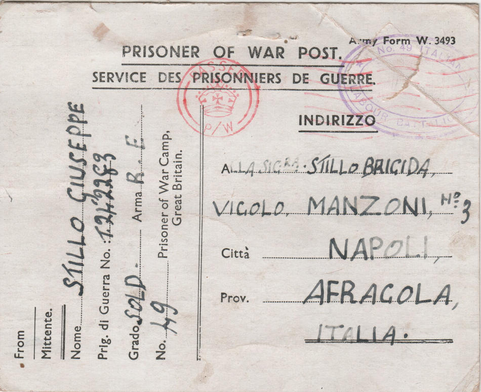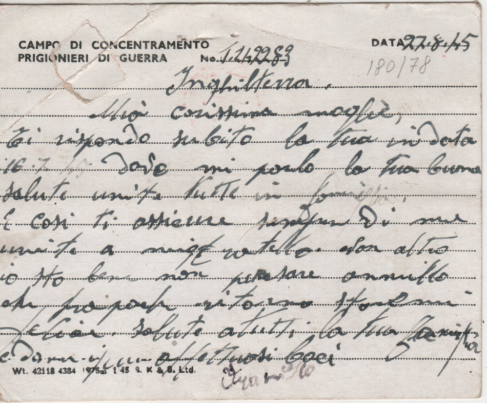 Cartolina scritta il 22.8.1945 nel campo di prigionia e spedita a Afragola (provincia di Napoli) in Italia