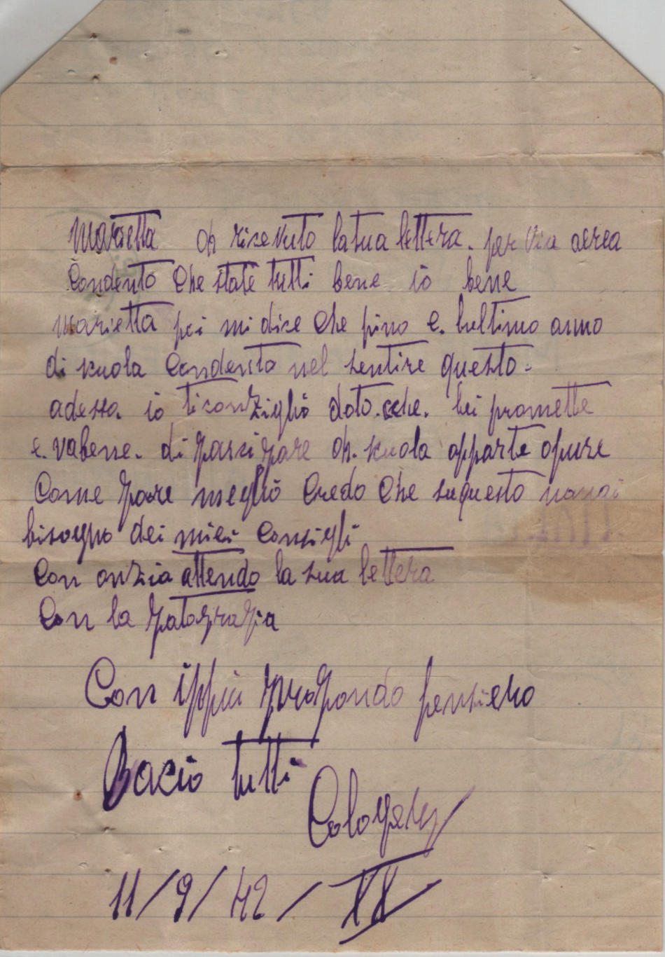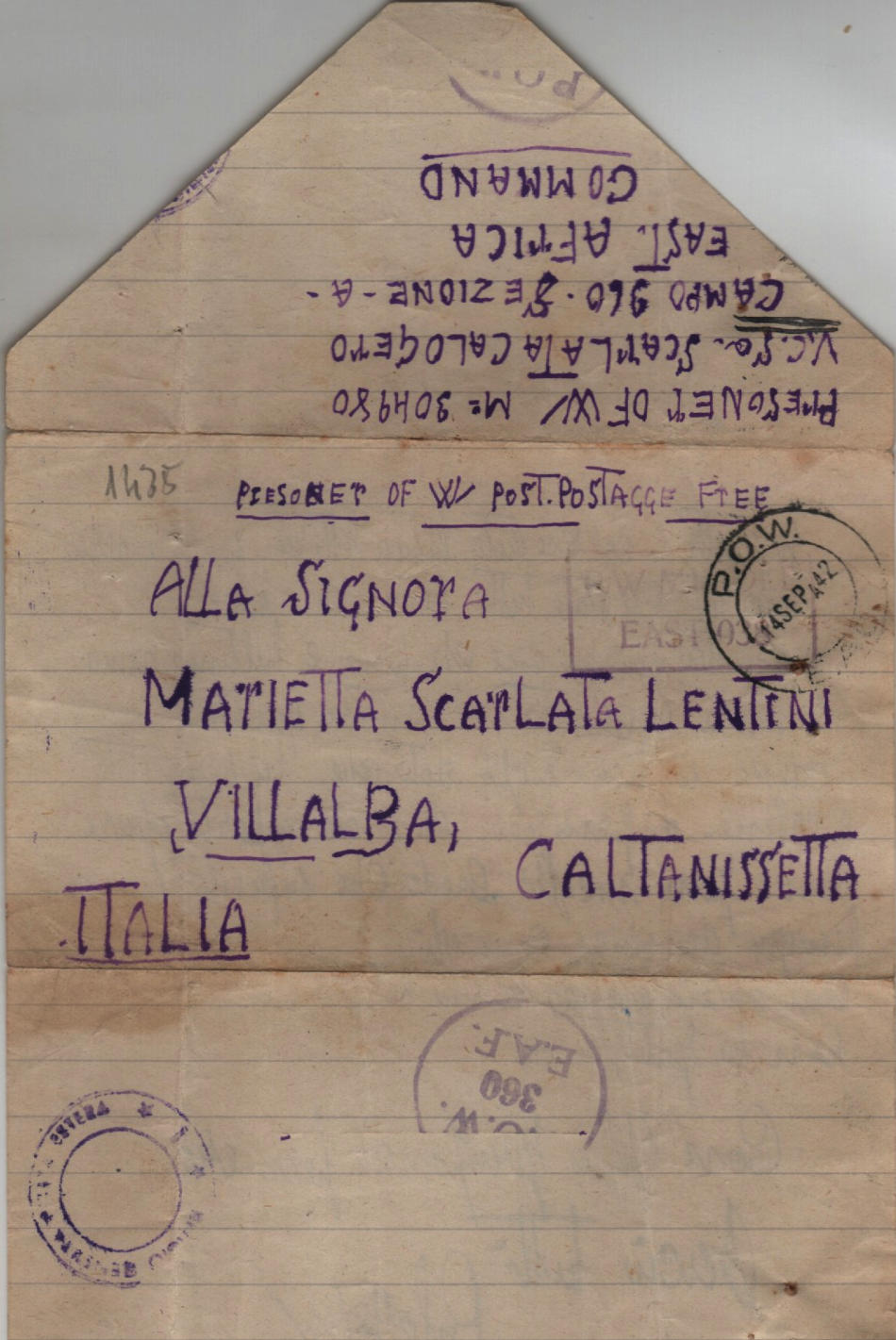Lettera scritta l’11.9.1942 nel campo di prigionia e spedita a Villalba (provincia di Caltanissetta) in Italia