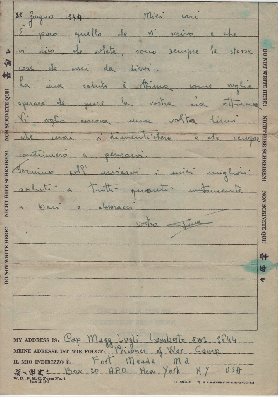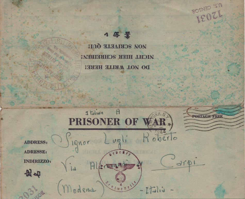 Lettera scritta il 27 Giugno 1944 dal campo di prigionia e spedita a Carpi, provincia di Modena, in Italia