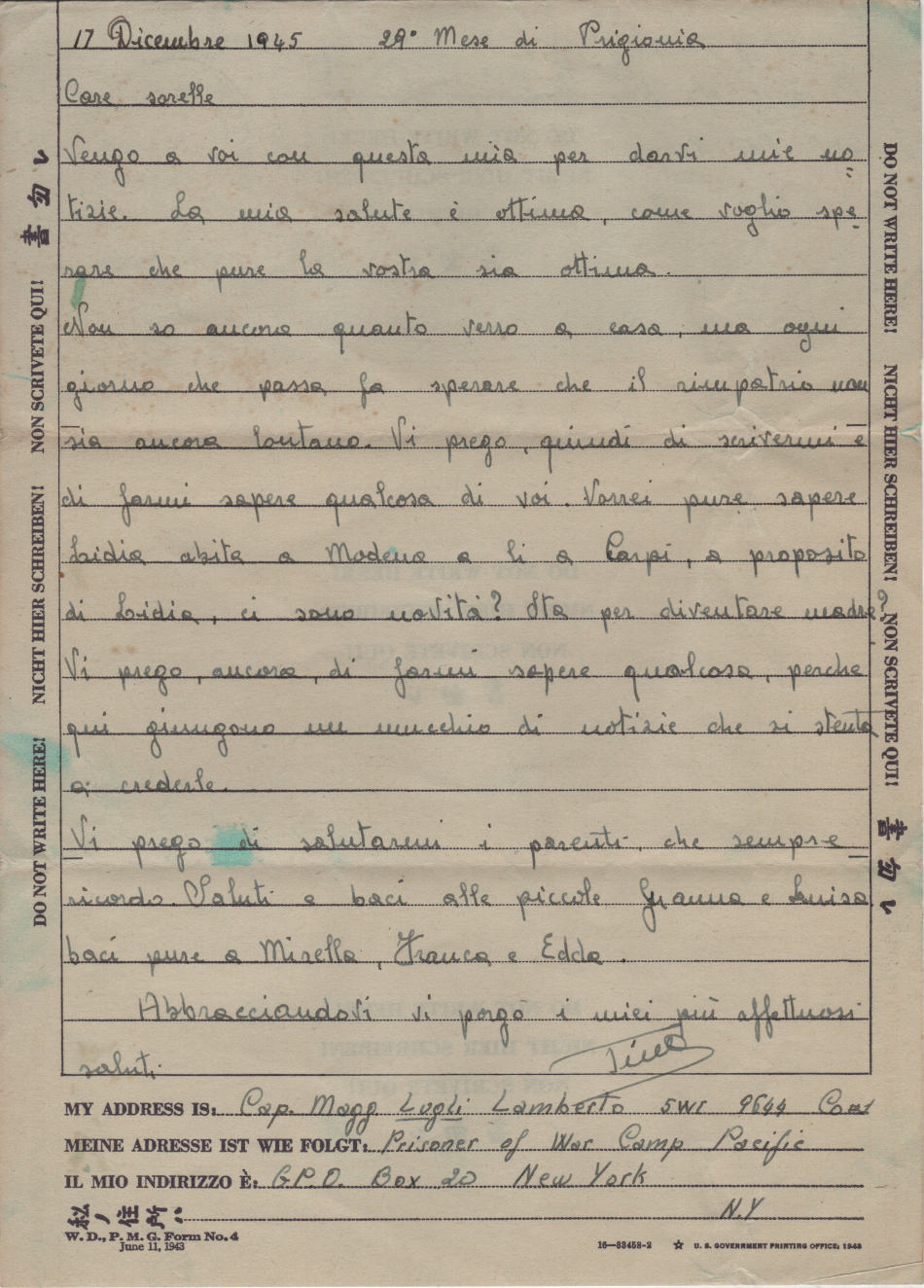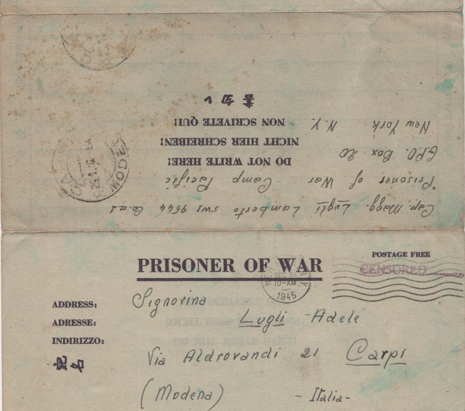 Lettera scritta il 17 Dicembre 1945 dal campo di prigionia e spedita a Carpi, provincia di Modena, in Italia
