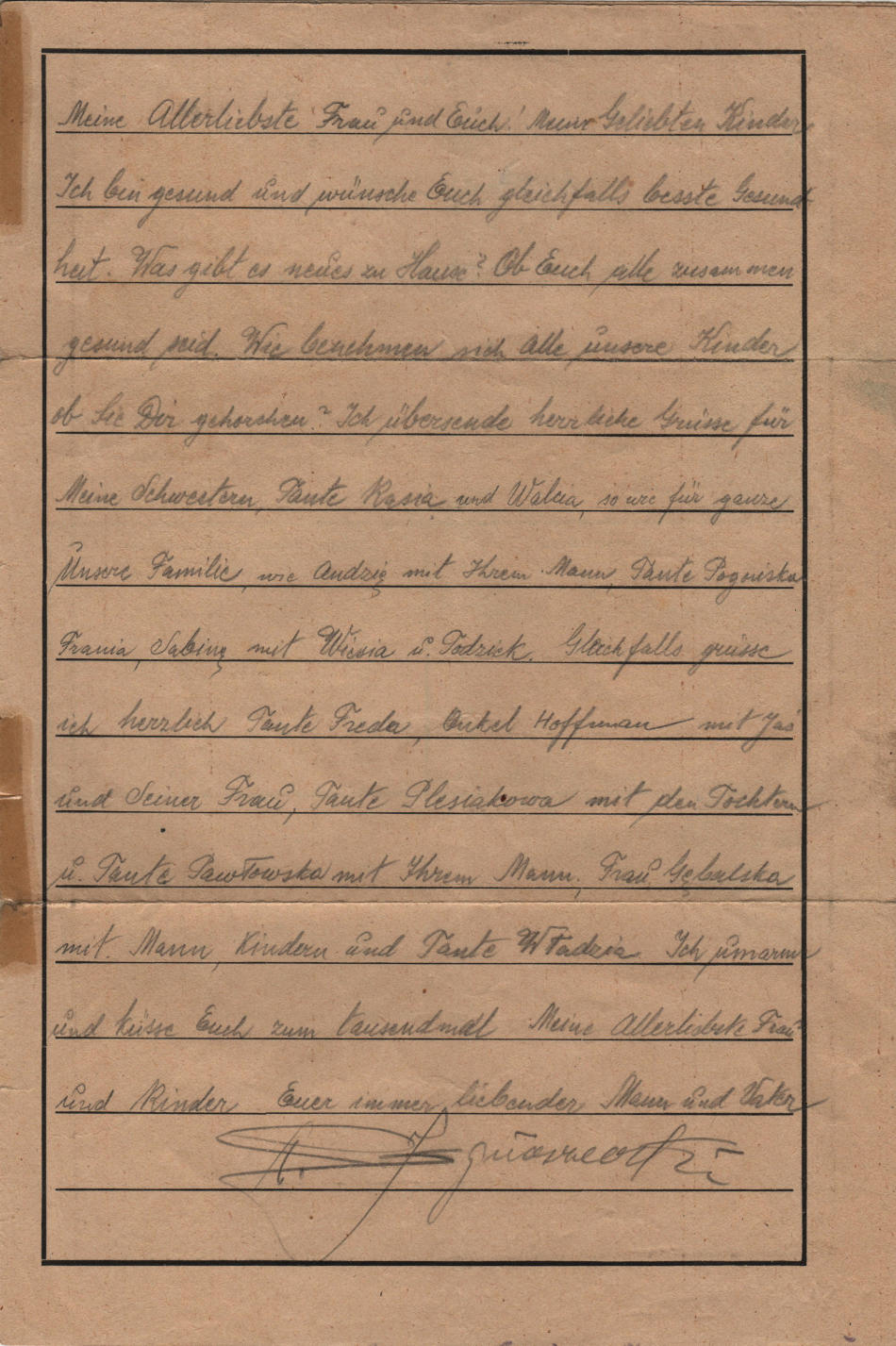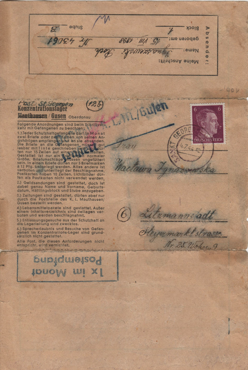 Lettera scritta nel campo di concentramento e spedita (timbro postale 4.7.1944) a Litzmannstadt (Lodz in Polonia)