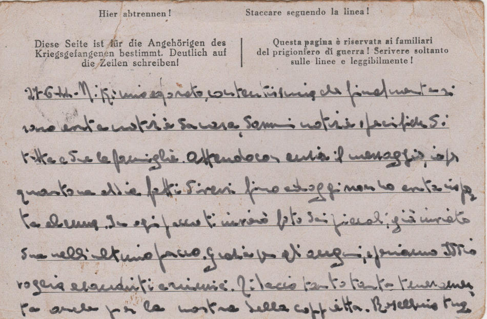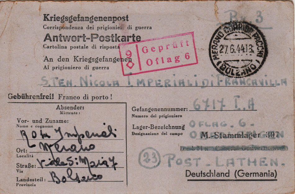 Cartolina scritta il 27.6.1944 a Merano, provincia di Bolzano (Italia) e spedita al campo di prigionia