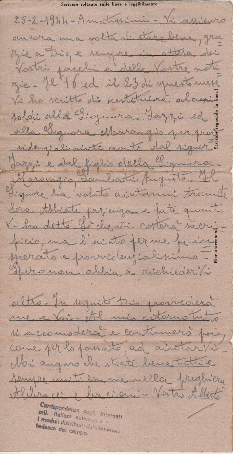 Lettera scritta il 25.2.1944 nel campo di prigionia e spedita a Lecce (Italia)
