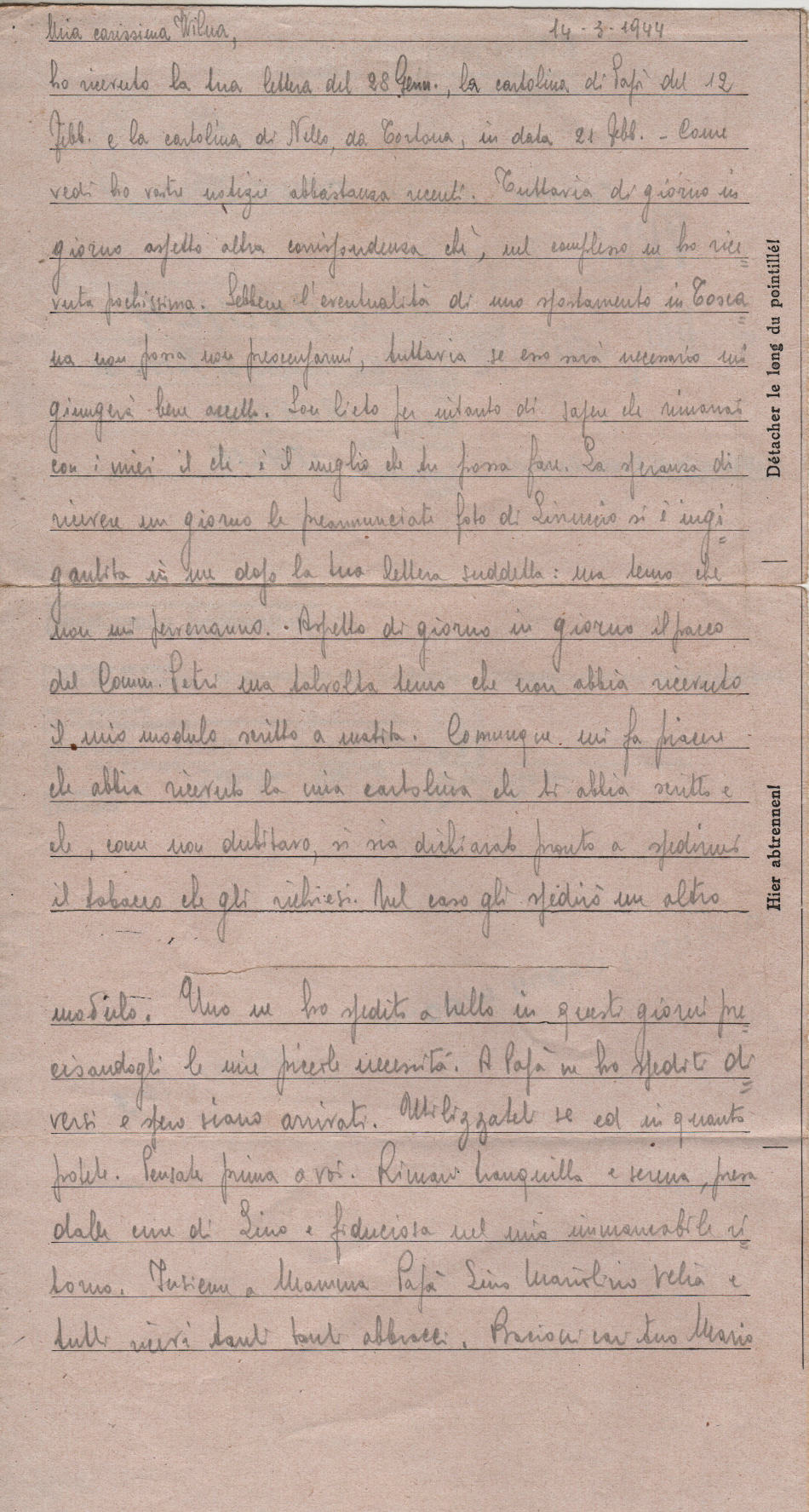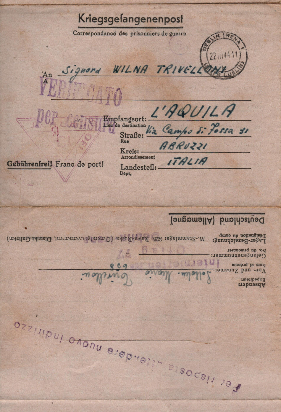Lettera scritta il 14.3.1944 nel campo di prigionia e spedita a L’Aquila (Italia)