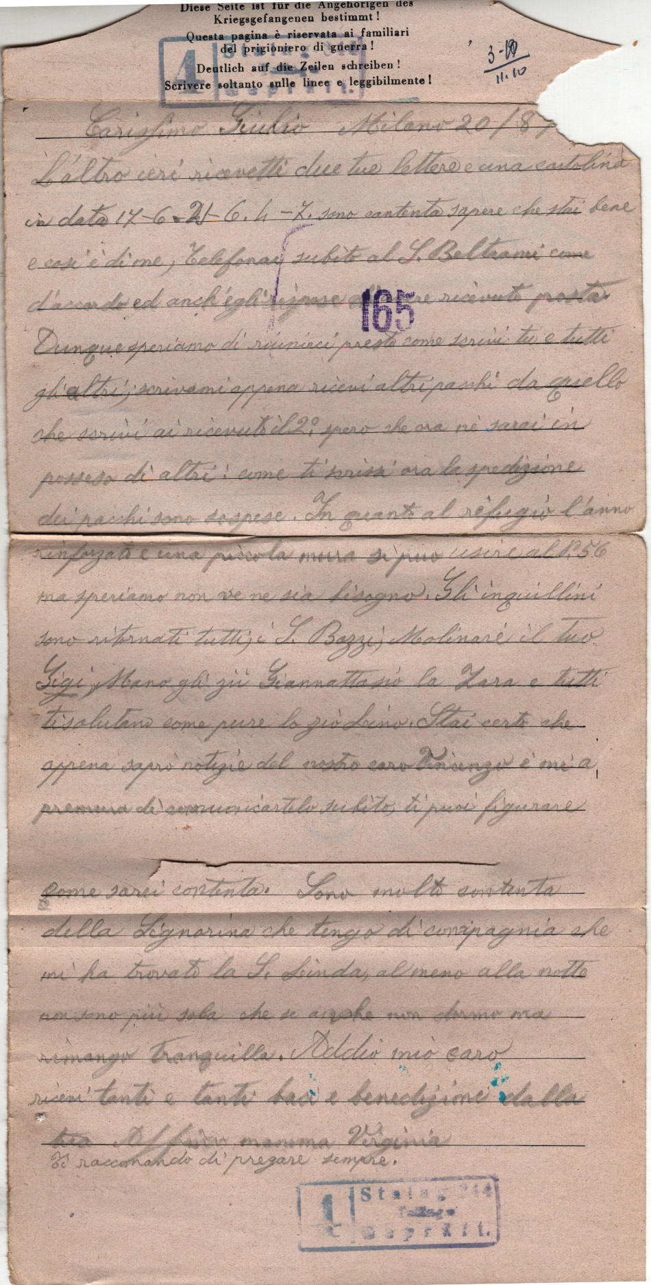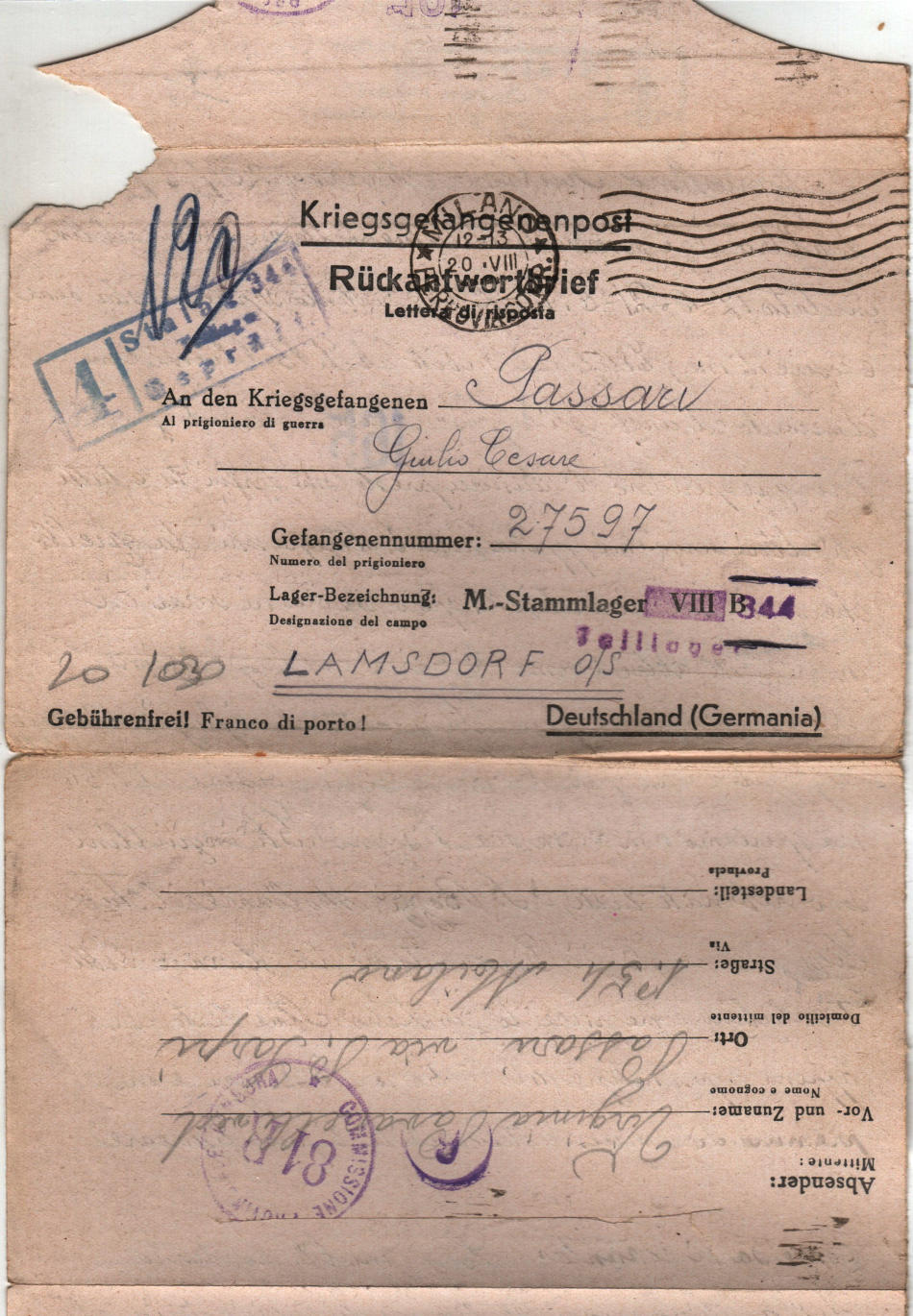 Lettera scritta il 20.8.1944 a Milano in Italia e spedita al campo di prigionia