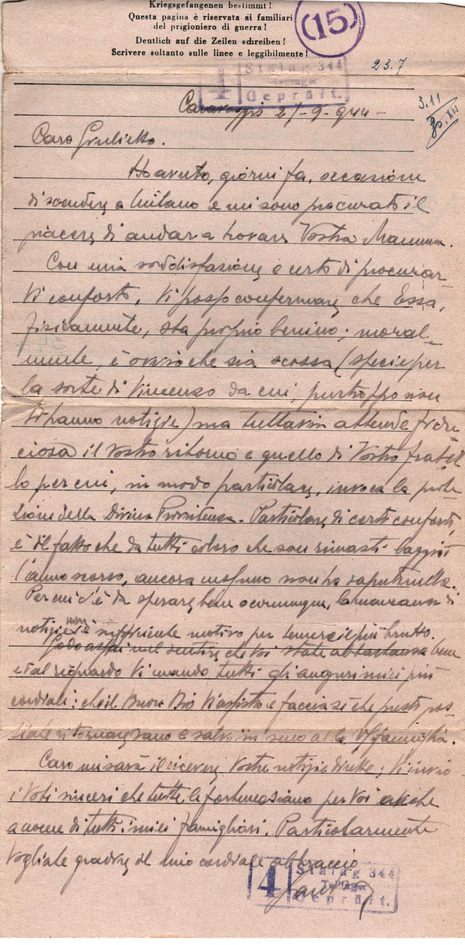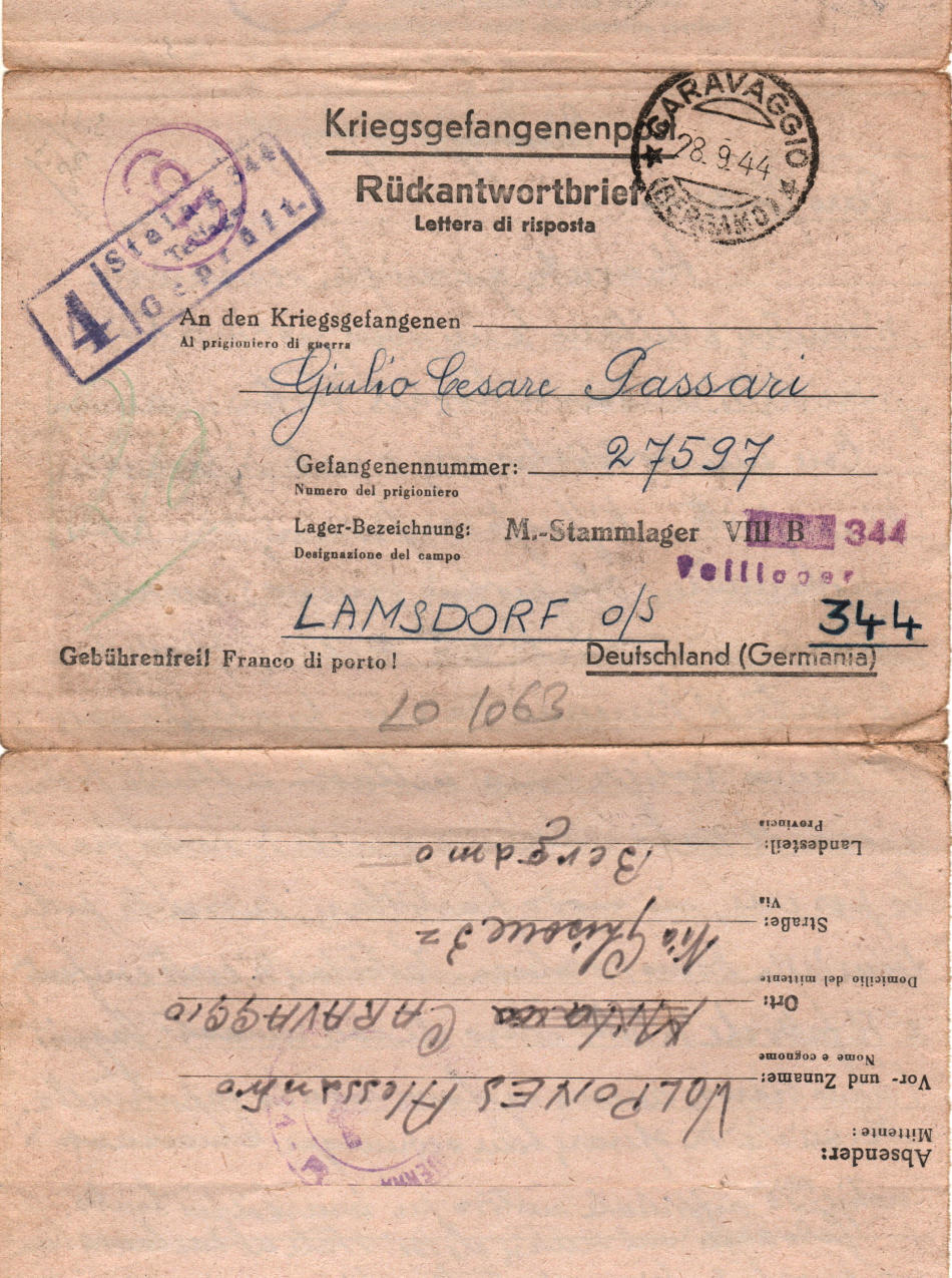 Lettera scritta il 2.9.1944 a Caravaggio (provincia di Bergamo) in Italia e spedita al campo di prigionia