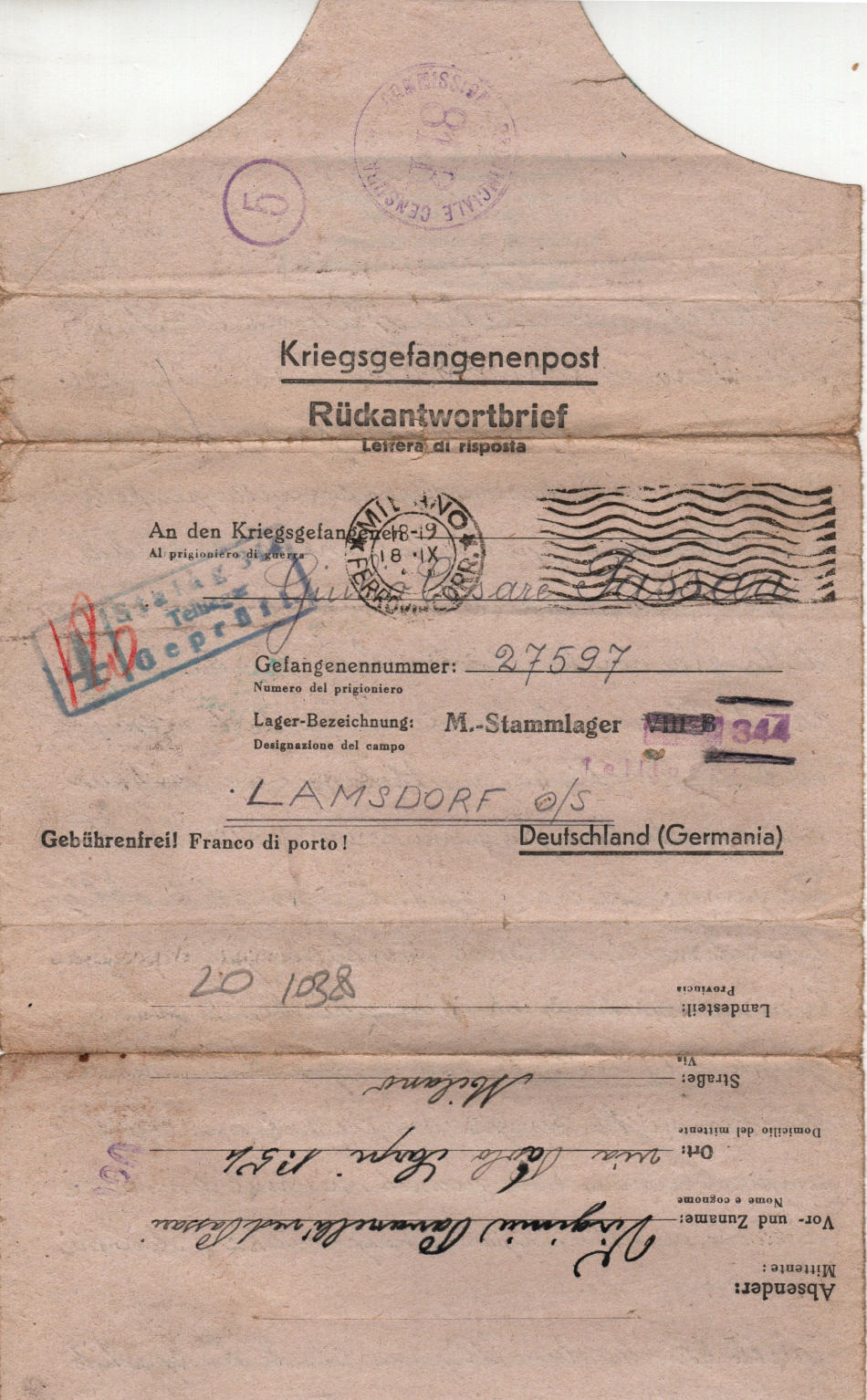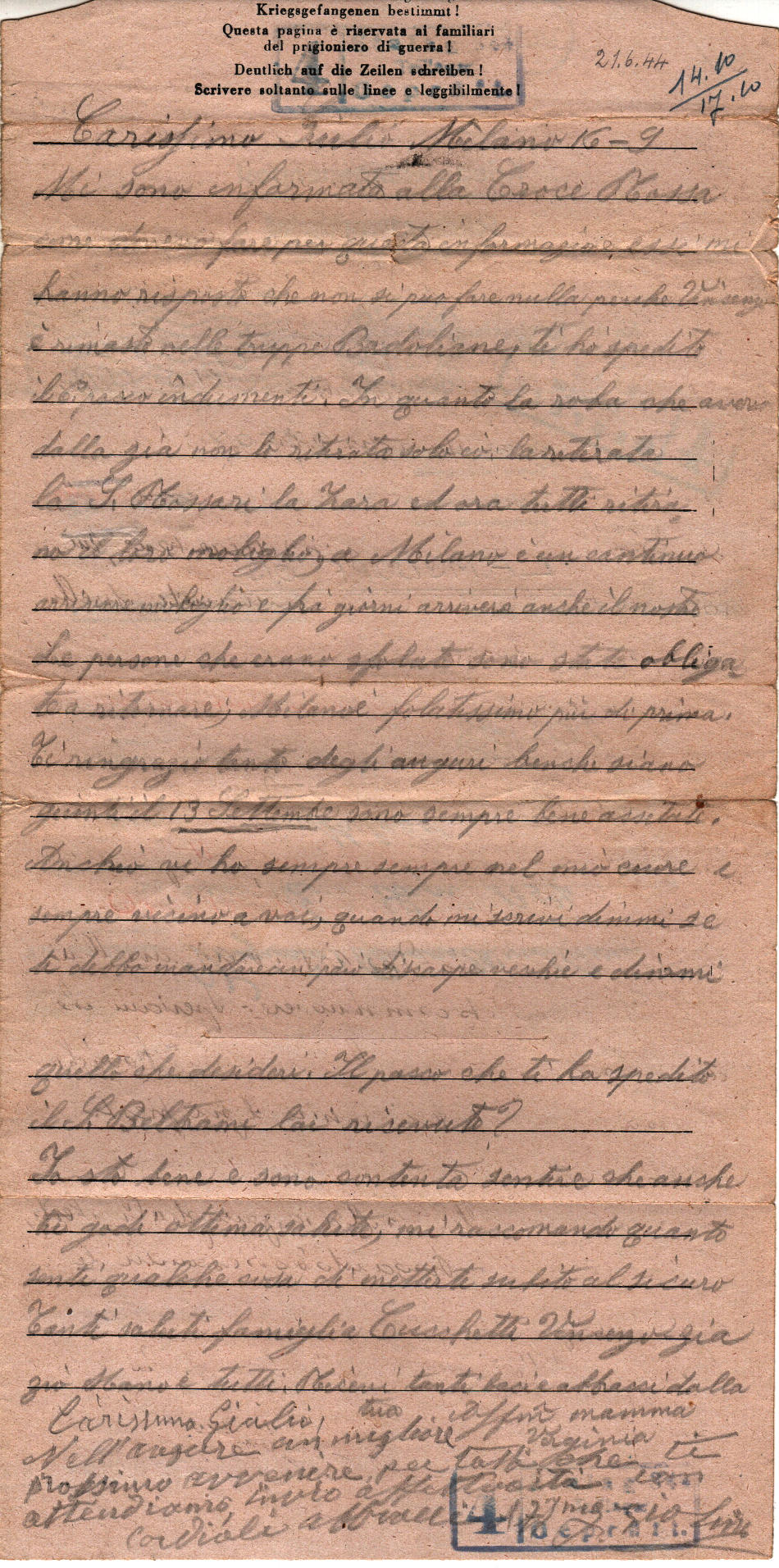Lettera scritta il 16.9.1944 a Milano in Italia e spedita al campo di prigionia