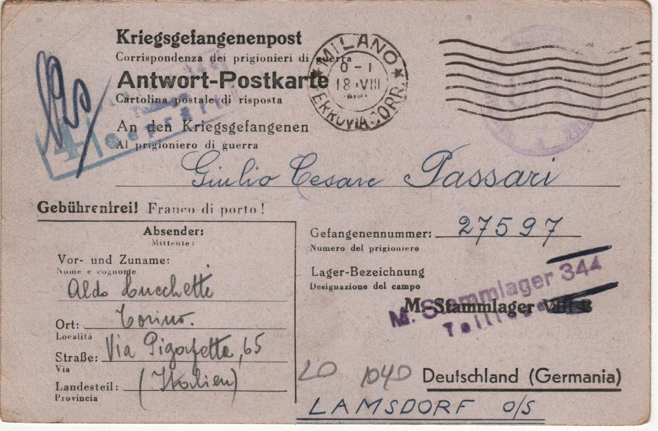 Cartolina scritta a Torino in Italia e spedita (timbro postale 18.8.1944) al campo di prigionia