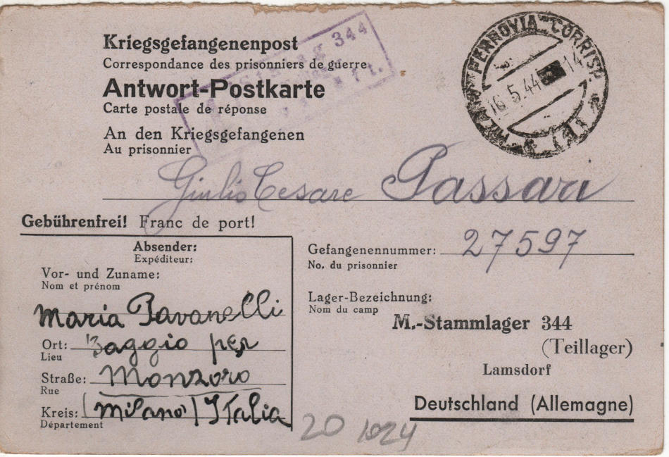 Cartolina scritta a Milano in Italia e spedita (timbro postale 16.5.1944) al campo di prigionia