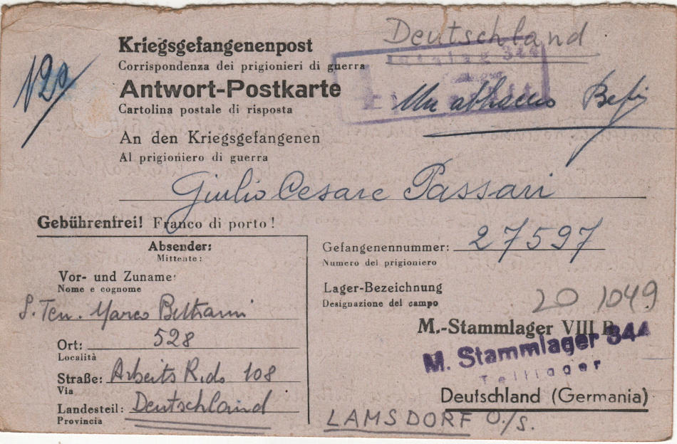 Cartolina scritta il 1.9.1944 dal campo di lavoro 108 (località 528) in Germania e spedita al campo di prigionia