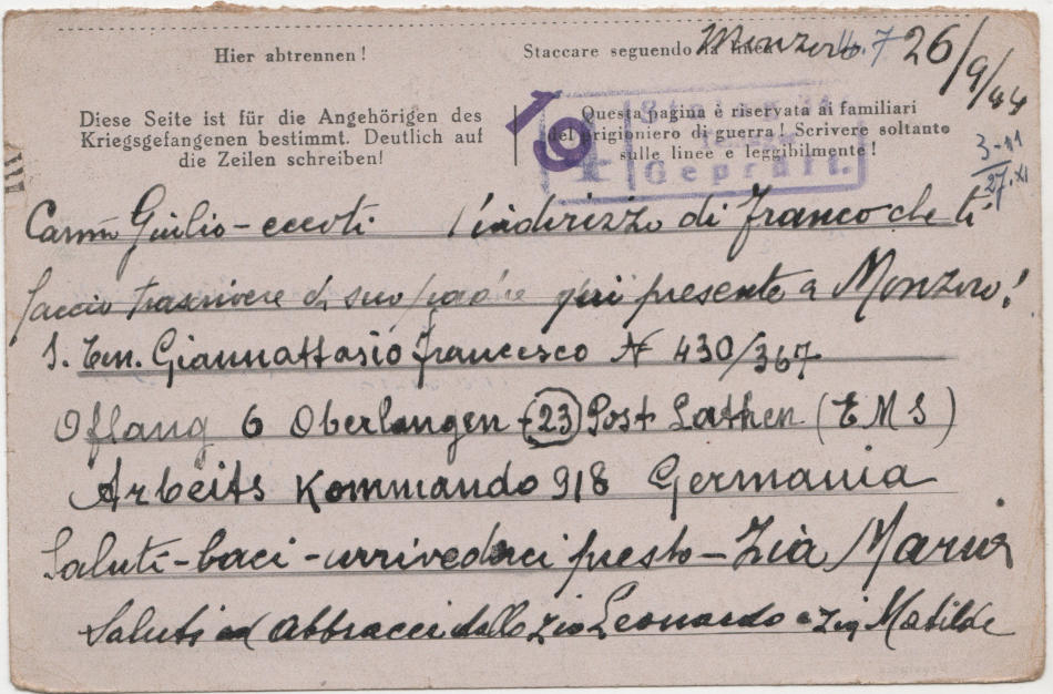 Cartolina scritta il 26.9.1944 a Milano in Italia e spedita al campo di prigionia