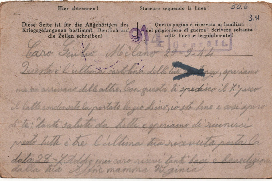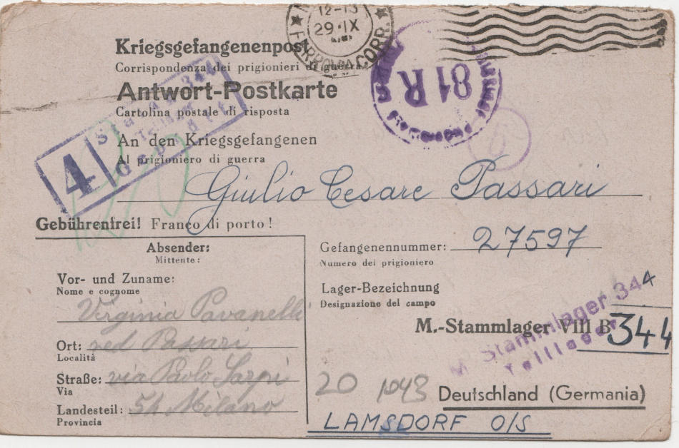 Cartolina scritta il 29.9.1944 a Milano in Italia e spedita al campo di prigionia