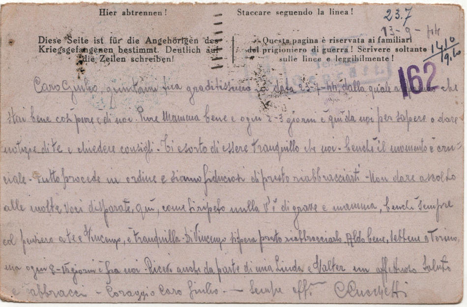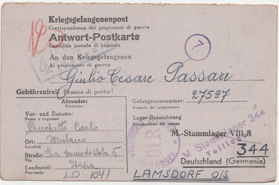 Cartolina scritta a Milano (in data 13.9.1944) in Italia e spedita al campo di prigionia