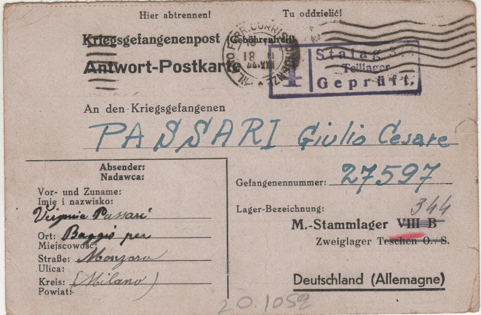 Cartolina scritta il 17.2.1944 a Monzoro, comune di Cusago (provincia di Milano) in Italia e spedita al campo di prigionia