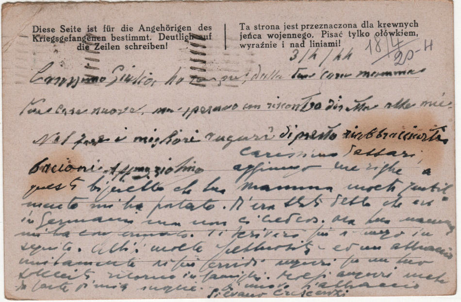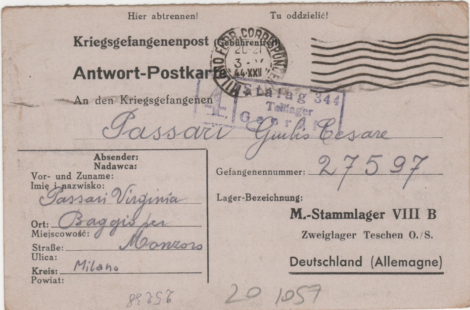 Cartolina scritta il 3.4.1944 a Monzoro (comune di Cusago) in provincia di Milano in Italia e spedita al campo di prigionia