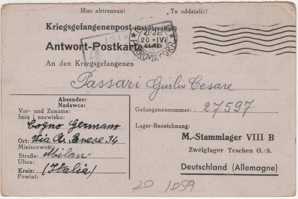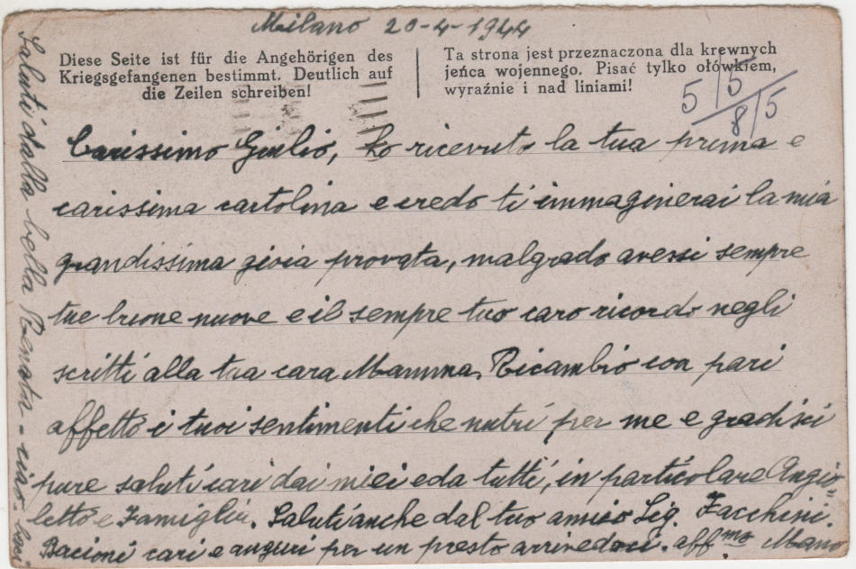 Cartolina scritta il 20.4.1944 a Milano in Italia e spedita al campo di prigionia