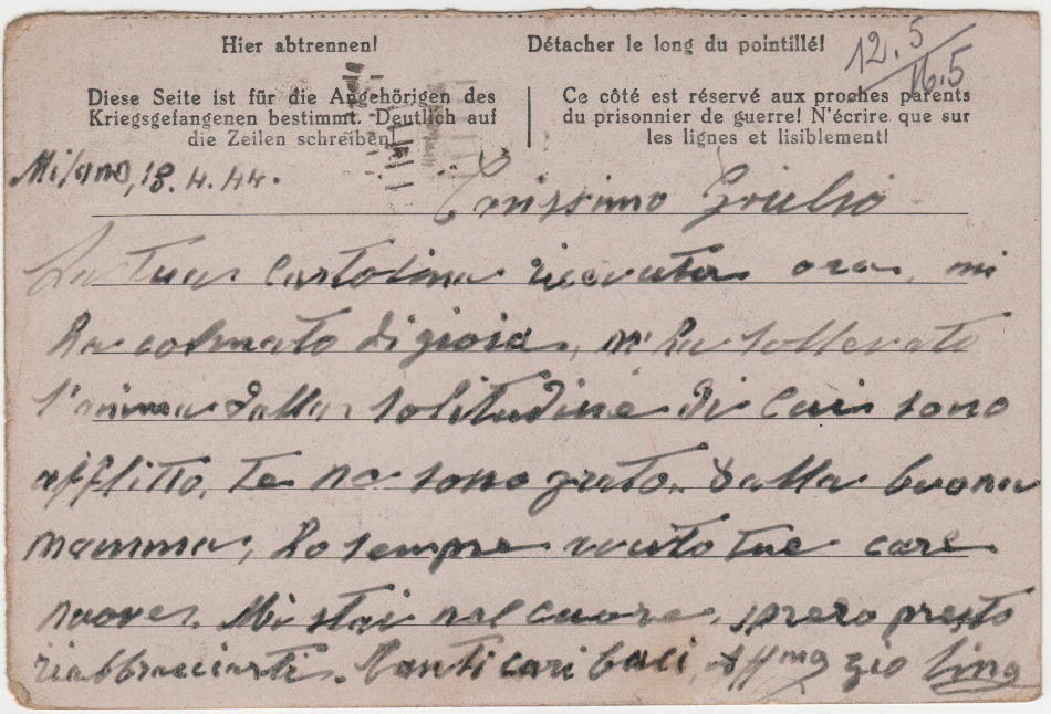 Cartolina scritta il 18.4.1944 a Milano in Italia e spedita al campo di prigionia