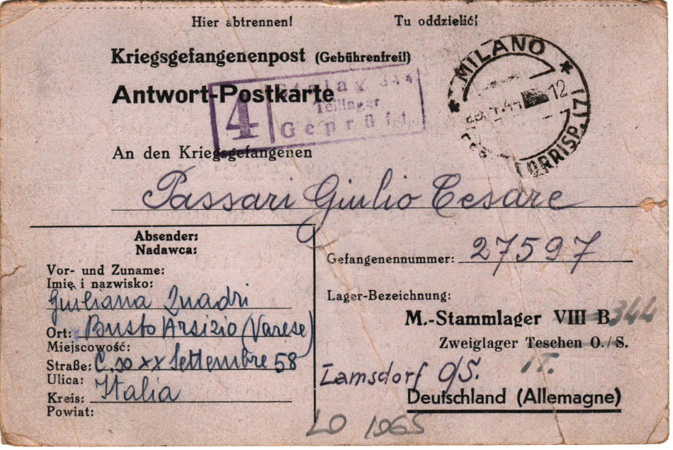 Cartolina scritta a Busto Arsizio (provincia di Varese) in Italia e spedita (timbro postale 29.4.1944) al campo di prigionia