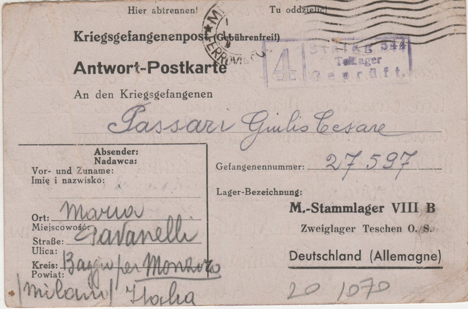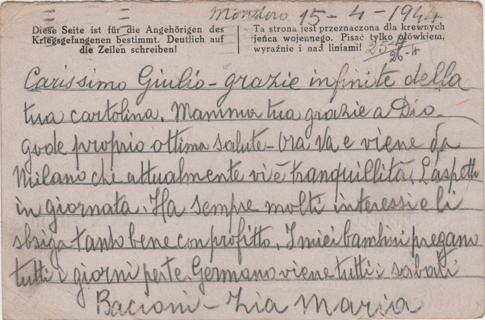 Cartolina scritta il 15.4.1944 a Monzoro (comune di Cusago) in provincia di Milano in Italia e spedita al campo di prigionia