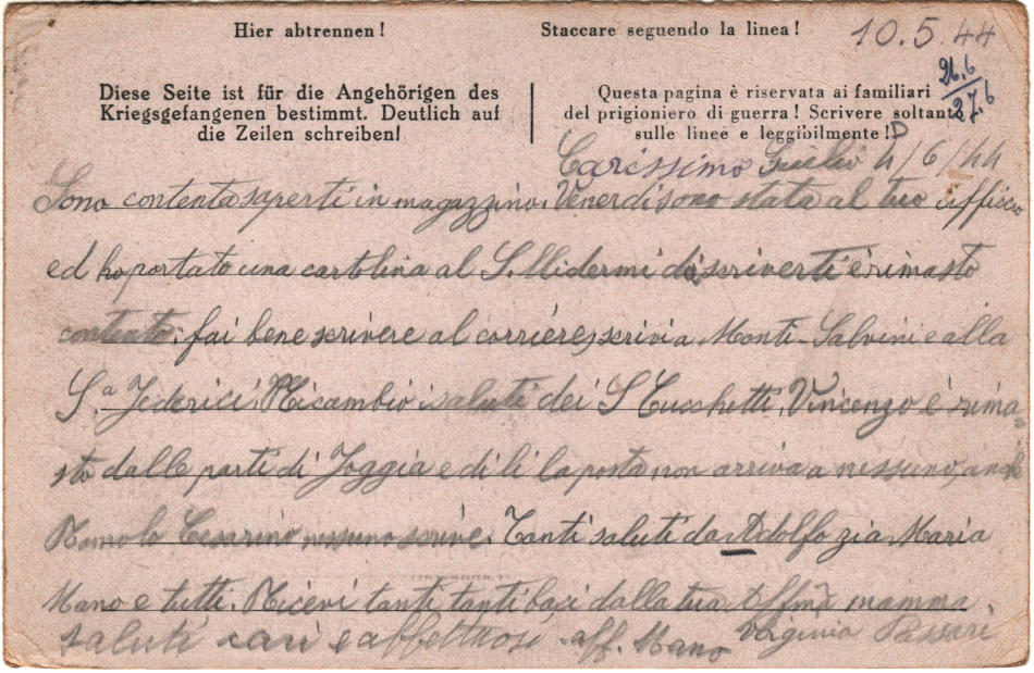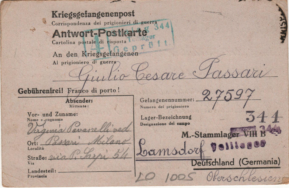 Cartolina scritta il 4.6.1944 a Milano in Italia e spedita al campo di prigionia